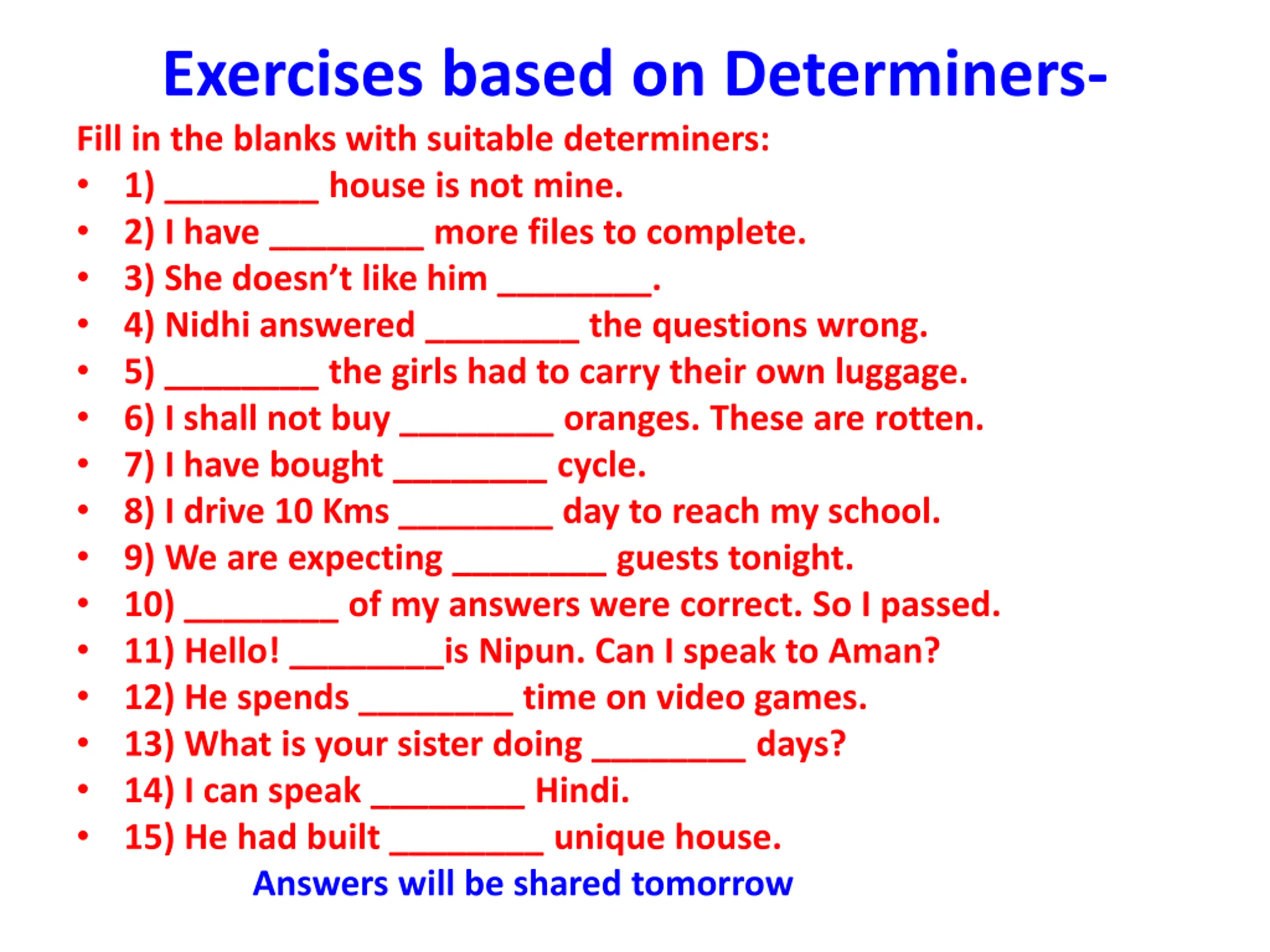 Exercises based on Determiners- Fill in the blanks with suitable determiners: 1) ________ house is not mine. 2) I have ________ more files to complete. 3) She doesn t like him ________. 4) Nidhi answered ________ the questions wrong. 5) ________ the girls had to carry their own luggage. 6) I shall not buy ________ oranges. These are rotten. 7) I have bought ________ cycle. 8) I drive 10 Kms ________ day to reach my school. 9) We are expecting ________ guests tonight. 10) ________ of my answers were correct. So I passed. 11) Hello! ________is Nipun. Can I speak to Aman? 12) He spends ________ time on video games. 13) What is your sister doing ________ days? 14) I can speak ________ Hindi. 15) He had built ________ unique house. Answers will be shared tomorrow