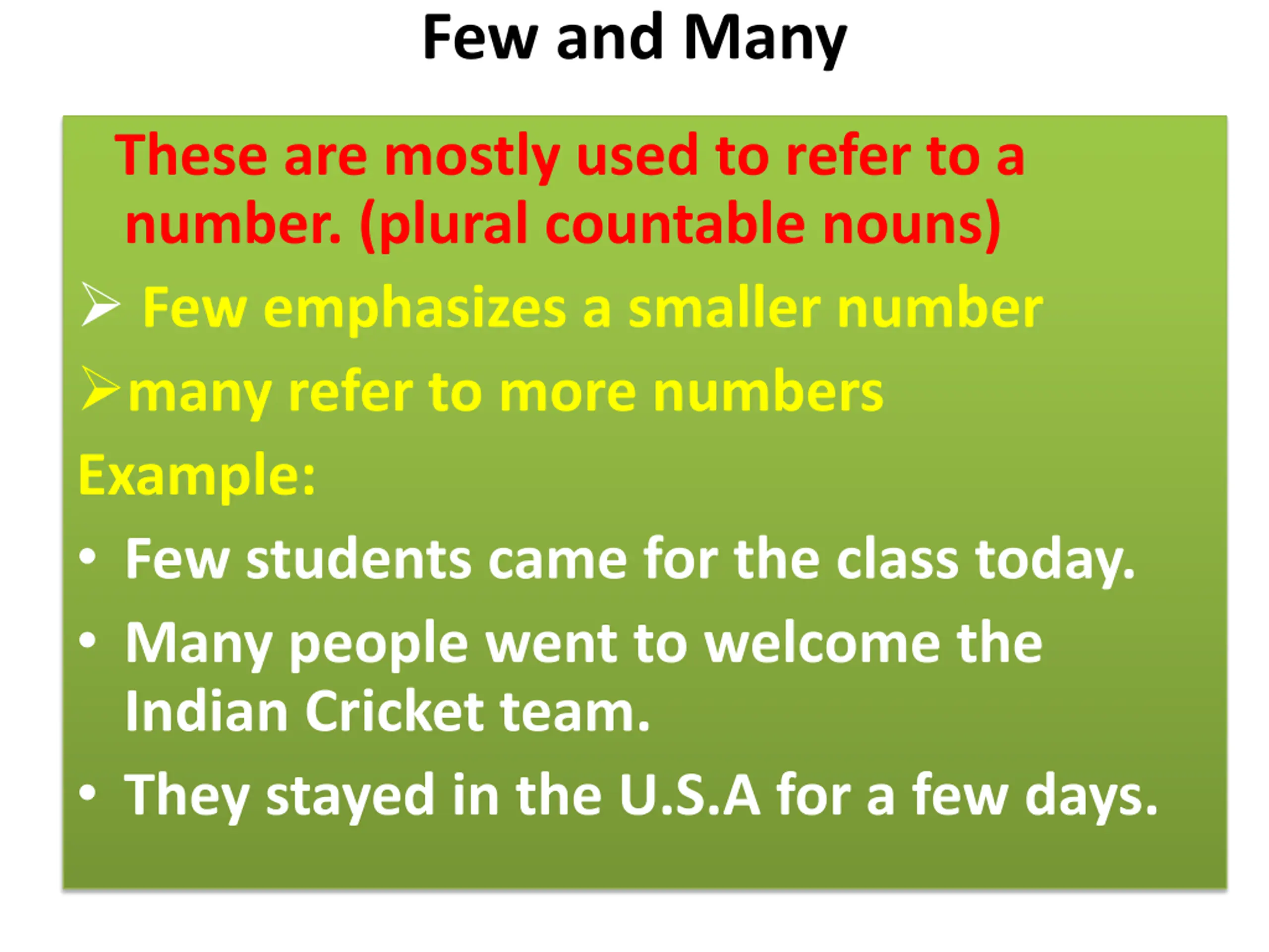 Few and Many These are mostly used to refer to a number. (plural countable nouns) Few emphasizes a smaller number many refer to more numbers Example: Few students came for the class today. Many people went to welcome the Indian Cricket team. They stayed in the U.S.A for a few days.