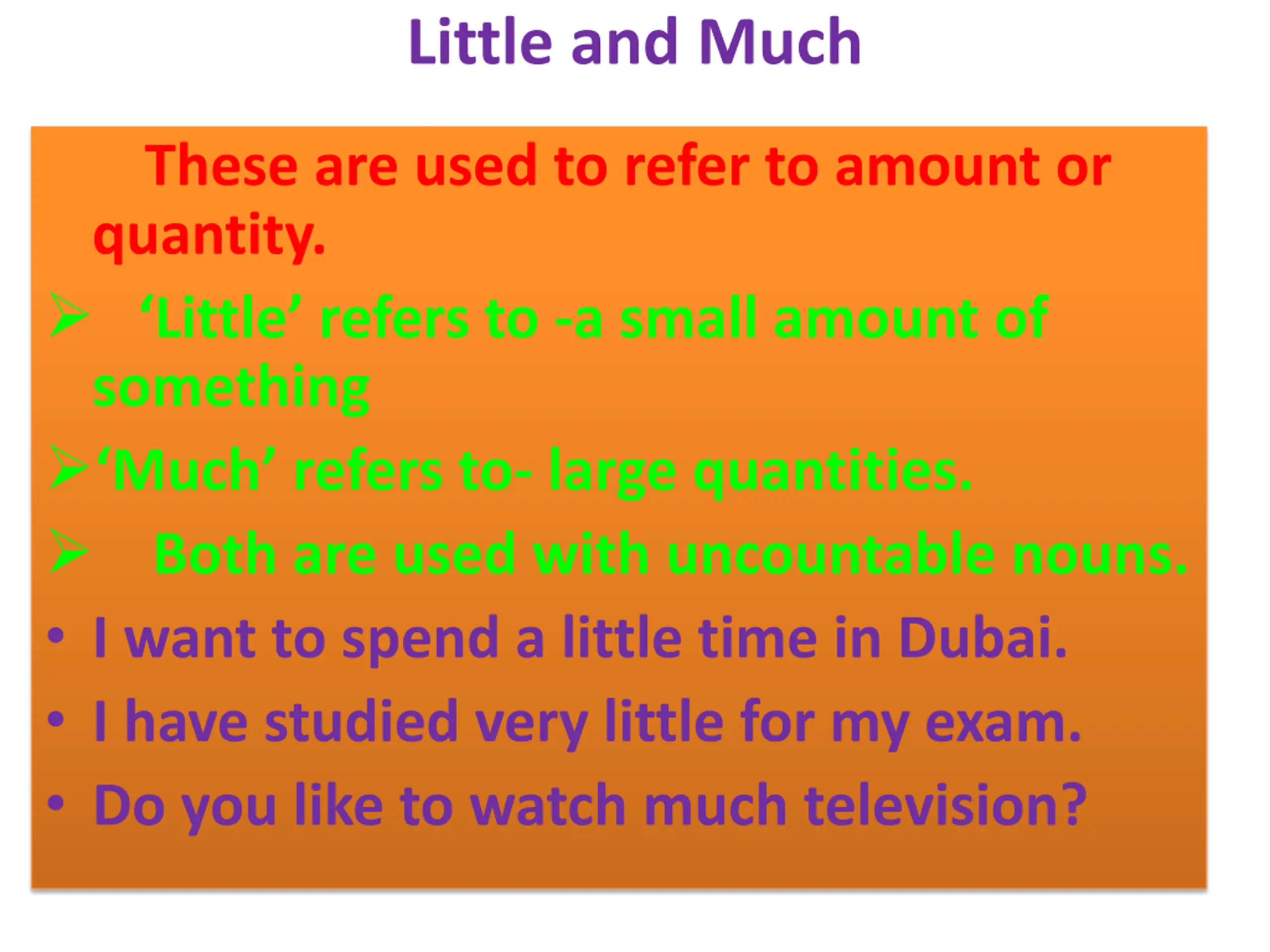 Little and Much These are used to refer to amount or quantity. Little refers to -a small amount of something Much refers to- large quantities. Both are used with uncountable nouns. I want to spend a little time in Dubai. I have studied very little for my exam. Do you like to watch much television?
