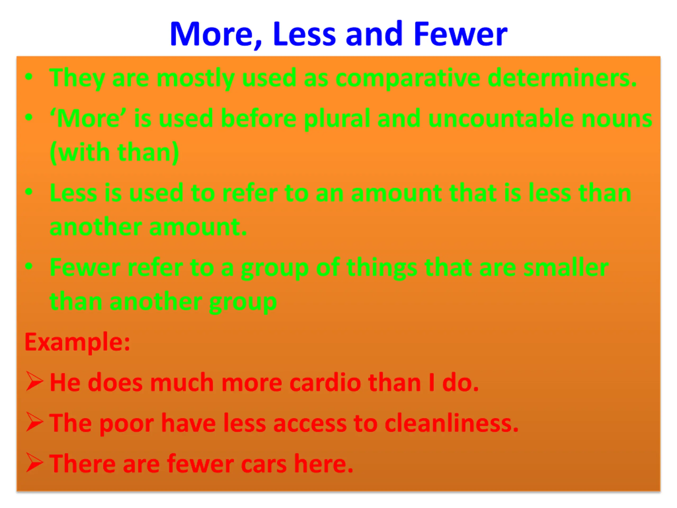 More, Less and Fewer They are mostly used as comparative determiners. More is used before plural and uncountable nouns (with than) Less is used to refer to an amount that is less than another amount. Fewer refer to a group of things that are smaller than another group Example: He does much more cardio than I do. The poor have less access to cleanliness. There are fewer cars here.