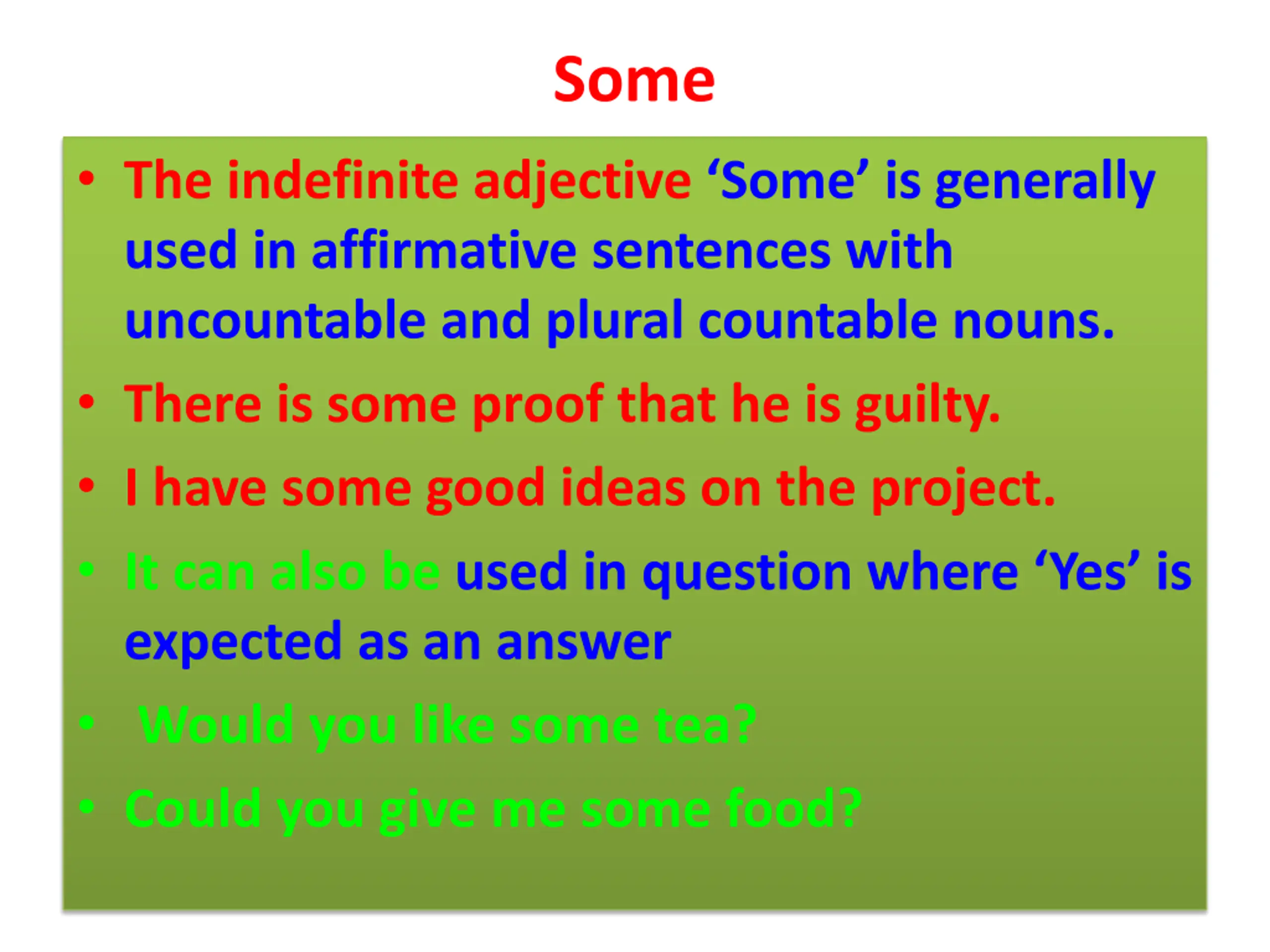 Some The indefinite adjective Some is generally used in affirmative sentences with uncountable and plural countable nouns. There is some proof that he is guilty. I have some good ideas on the project. It can also be used in question where Yes is expected as an answer Would you like some tea? Could you give me some food?