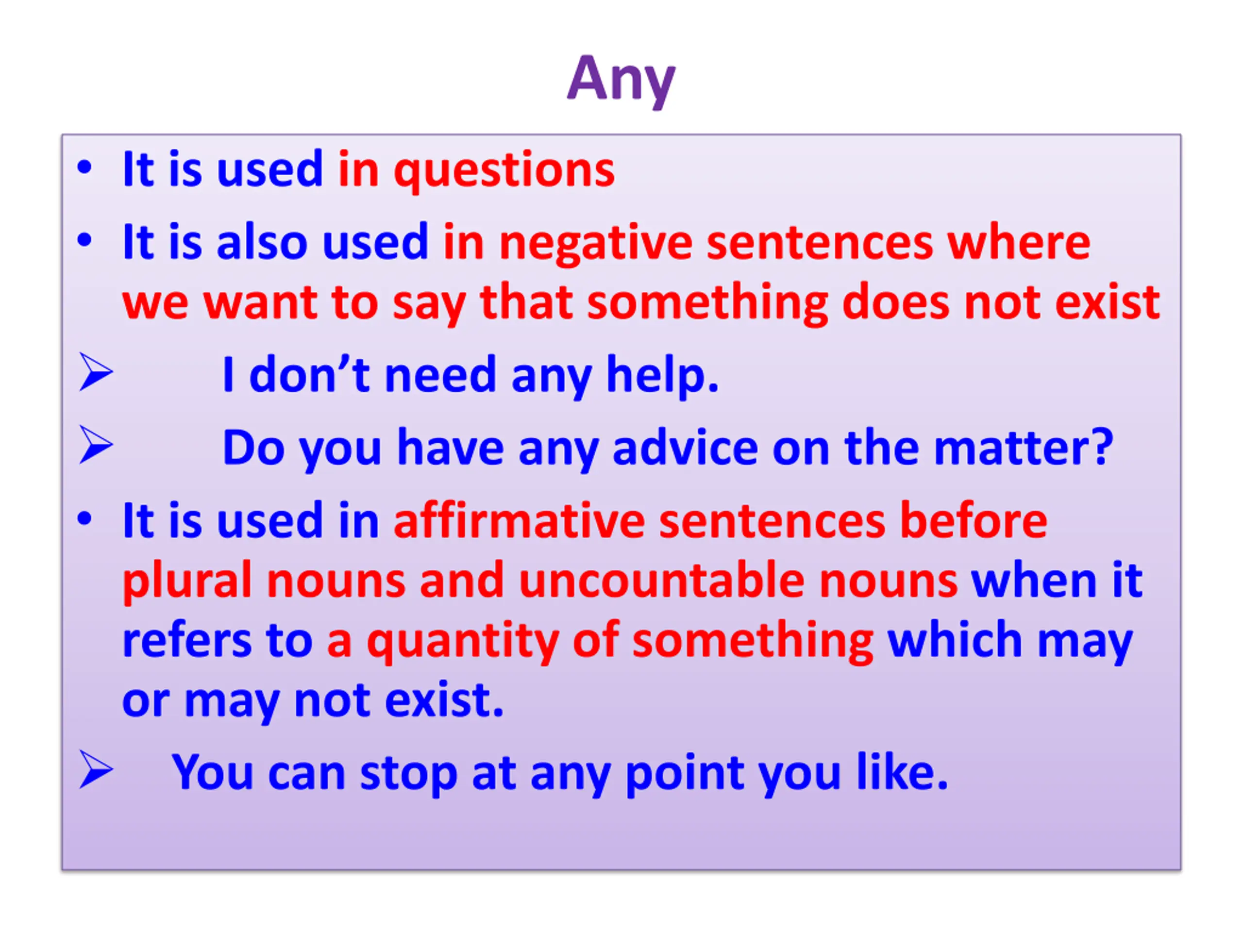 Any It is used in questions It is also used in negative sentences where we want to say that something does not exist I don t need any help. Do you have any advice on the matter? It is used in affirmative sentences before plural nouns and uncountable nouns when it refers to a quantity of something which may or may not exist. You can stop at any point you like.
