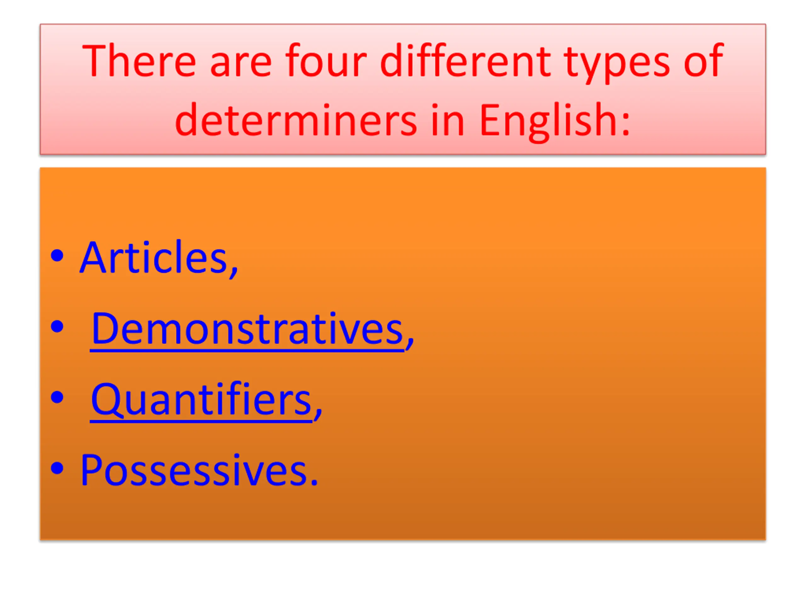 There are four different types of determiners in English: Articles, Demonstratives, Quantifiers, Possessives.