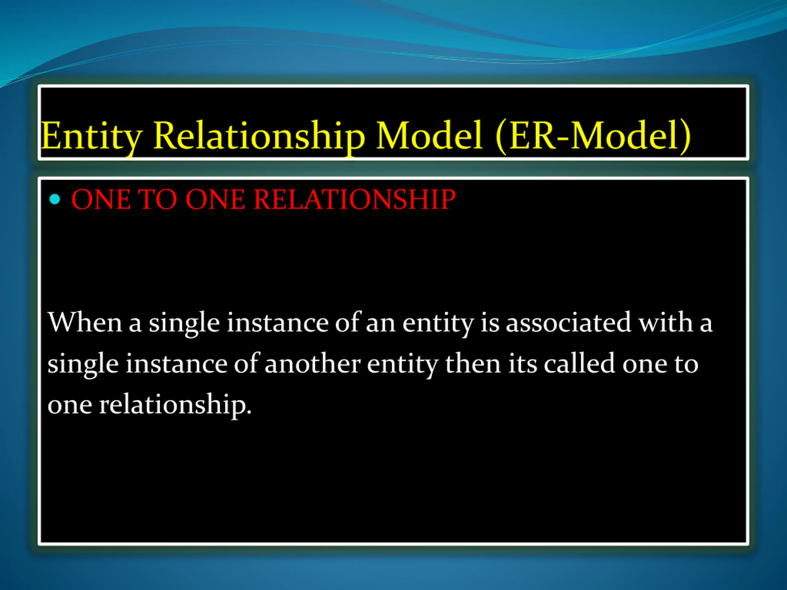 Entity Relationship Model (ER-Model) ONE TO ONE RELATIONSHIP When a single instance of an entity is associated with a single instance of another entity then its called one to one relationship.