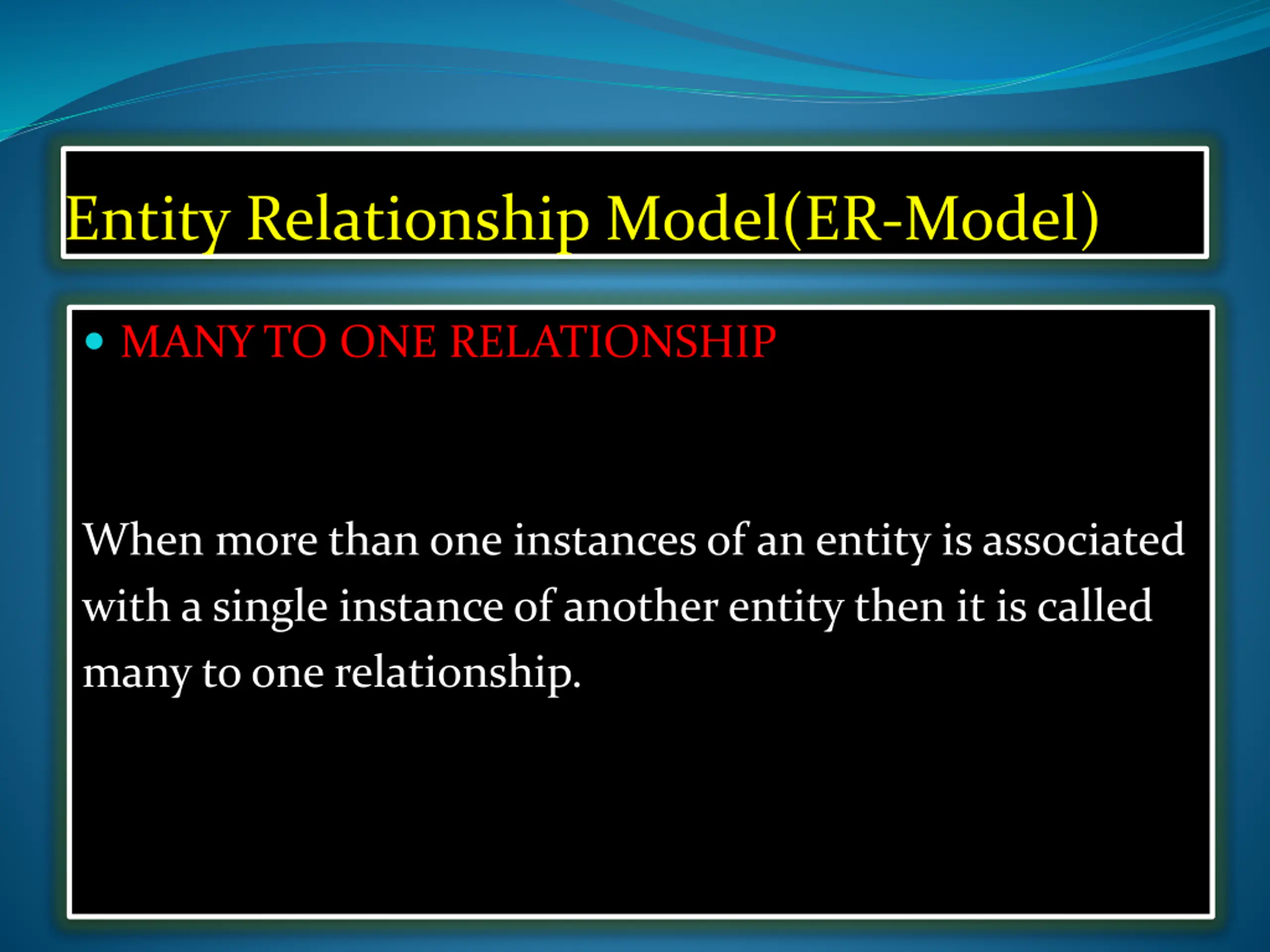 Entity Relationship Model(ER-Model) MANY TO ONE RELATIONSHIP When more than one instances of an entity is associated with a single instance of another entity then it is called many to one relationship.