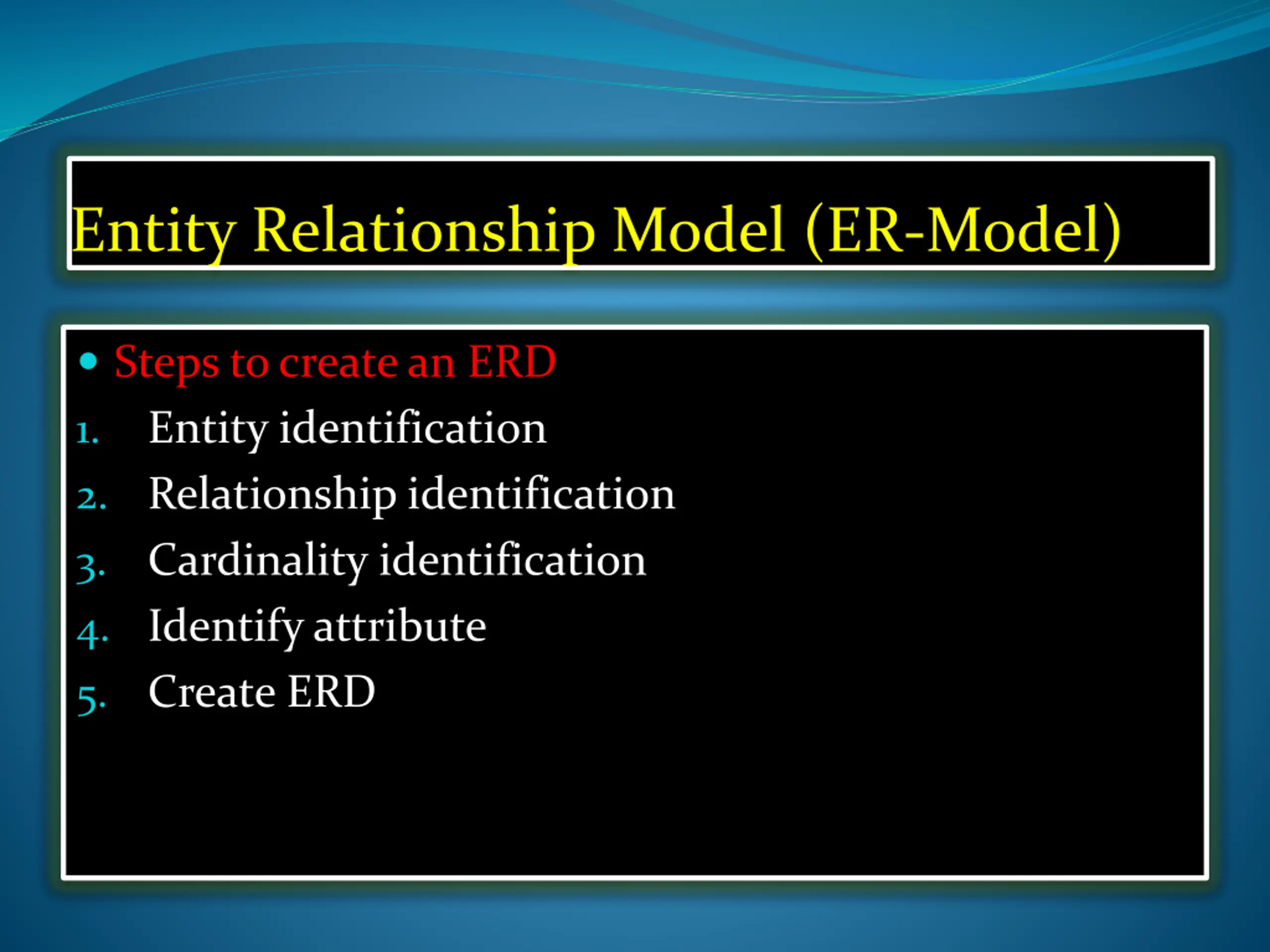Entity Relationship Model (ER-Model) Steps to create an ERD Entity identification 2. Relationship identification 3. Cardinality identification 4. Identify attribute 5. Create ERD 1.