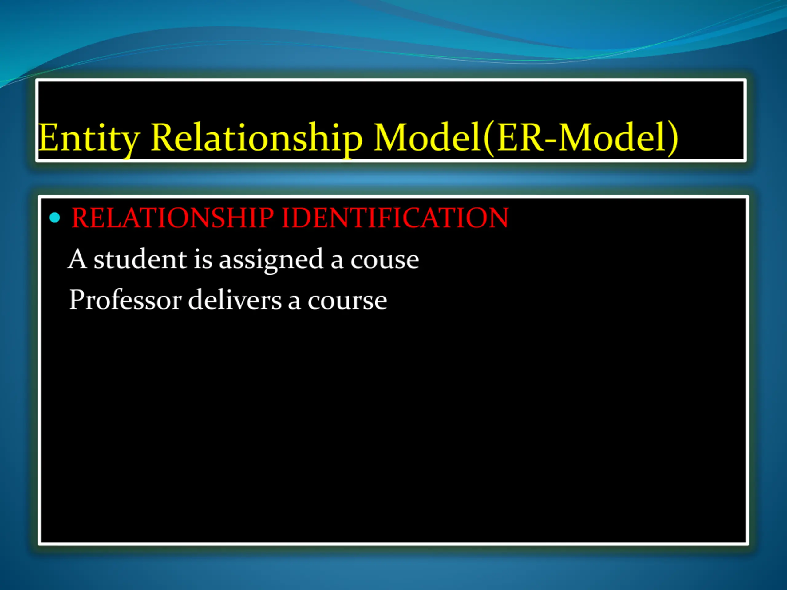 Entity Relationship Model(ER-Model) RELATIONSHIP IDENTIFICATION A student is assigned a couse Professor delivers a course