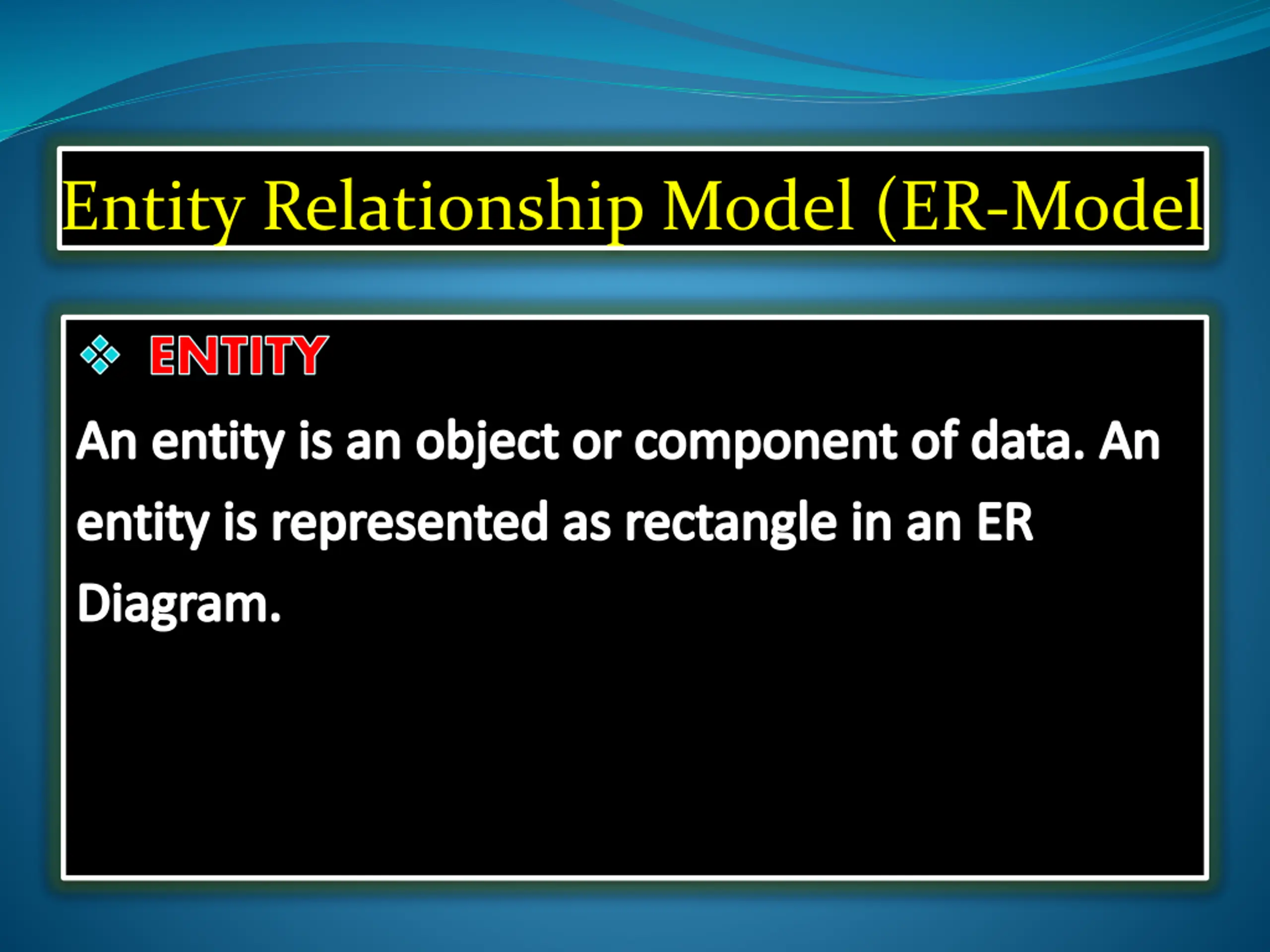 Entity Relationship Model (ER-Model ENTITY An entity is an object or component of data. An entity is represented as rectangle in an ER Diagram.