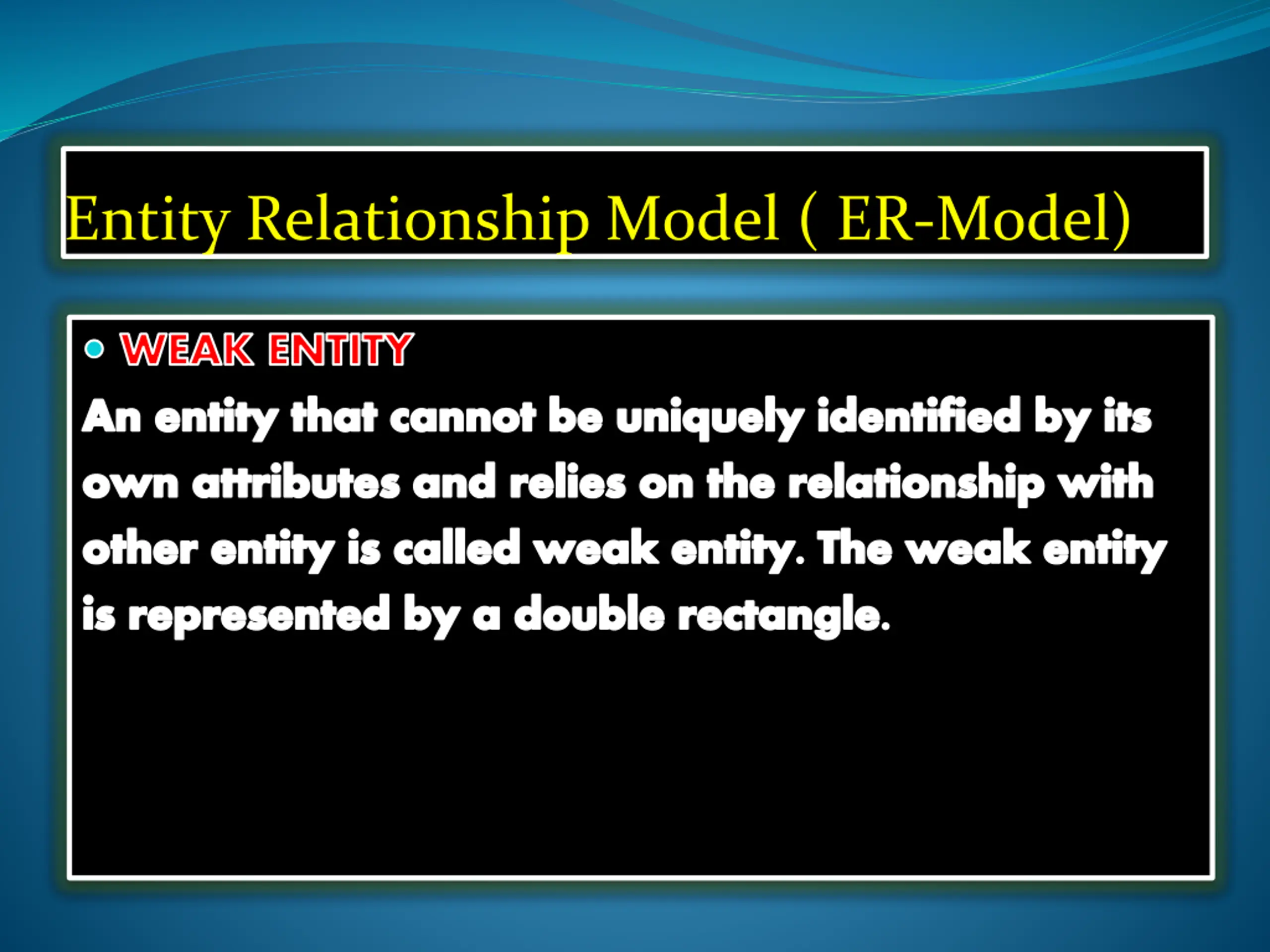 Entity Relationship Model ( ER-Model) WEAK ENTITY An entity that cannot be uniquely identified by its own attributes and relies on the relationship with other entity is called weak entity. The weak entity is represented by a double rectangle.