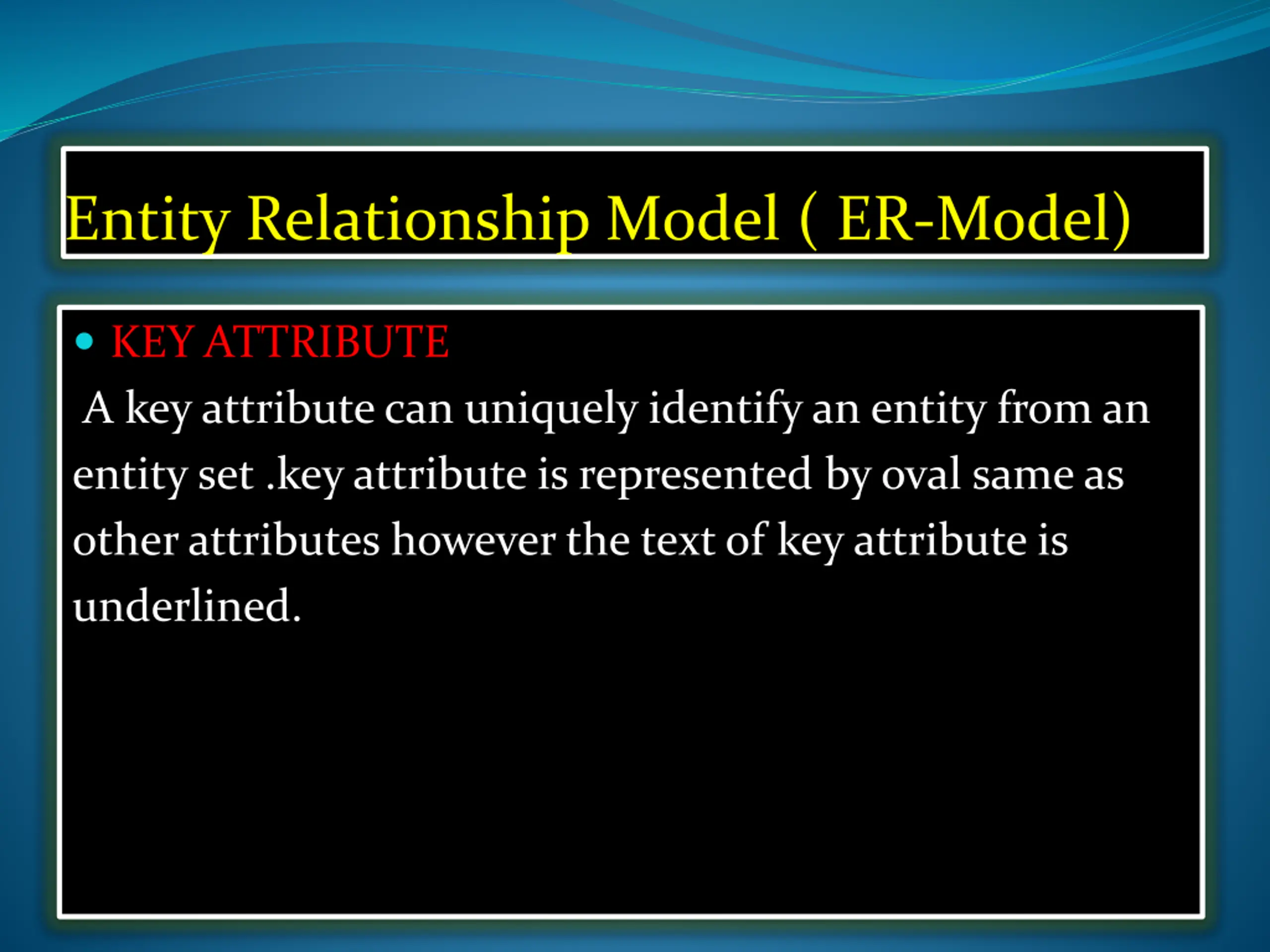 Entity Relationship Model ( ER-Model) KEY ATTRIBUTE A key attribute can uniquely identify an entity from an entity set .key attribute is represented by oval same as other attributes however the text of key attribute is underlined.
