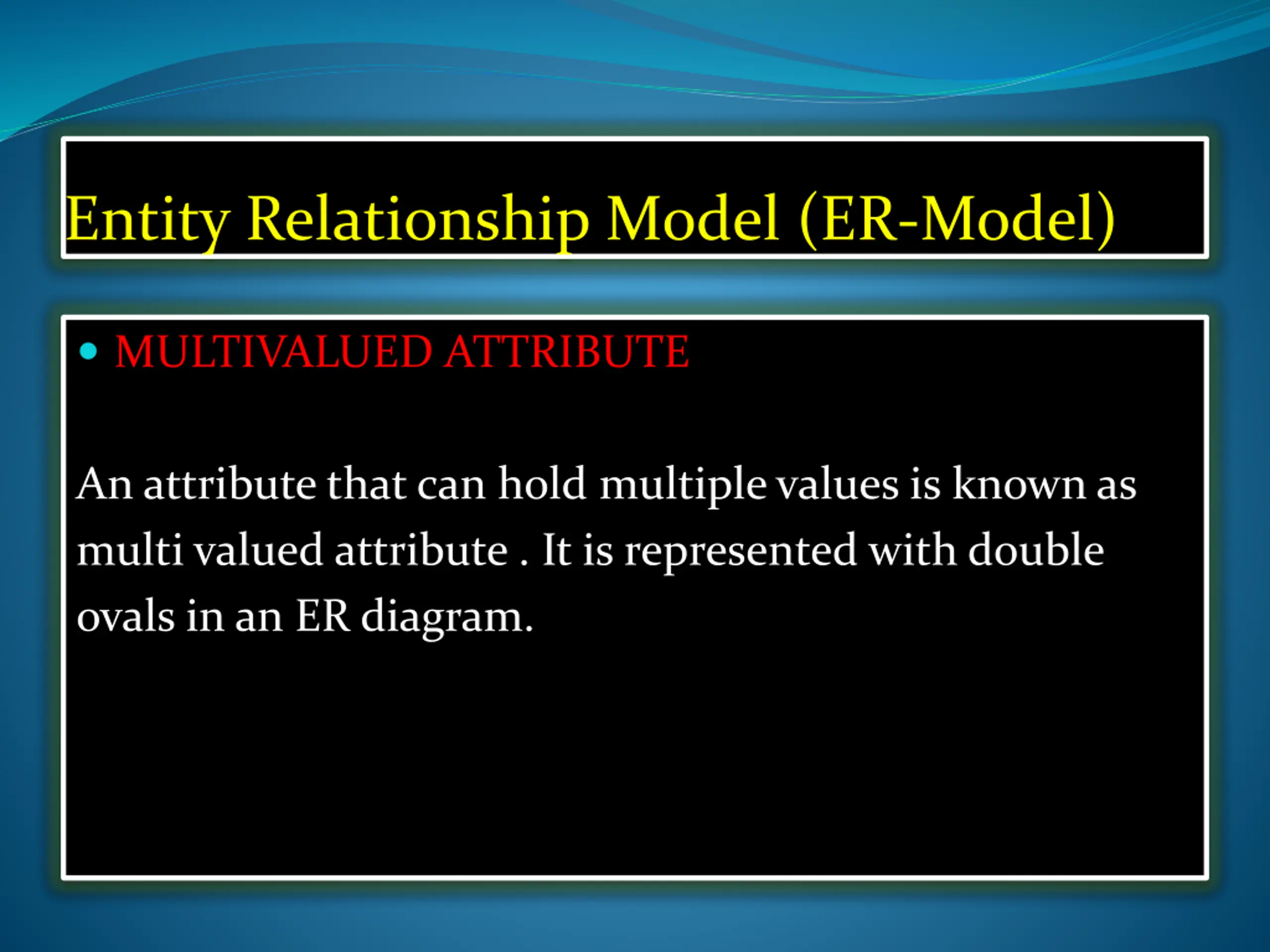 Entity Relationship Model (ER-Model) MULTIVALUED ATTRIBUTE An attribute that can hold multiple values is known as multi valued attribute . It is represented with double ovals in an ER diagram.