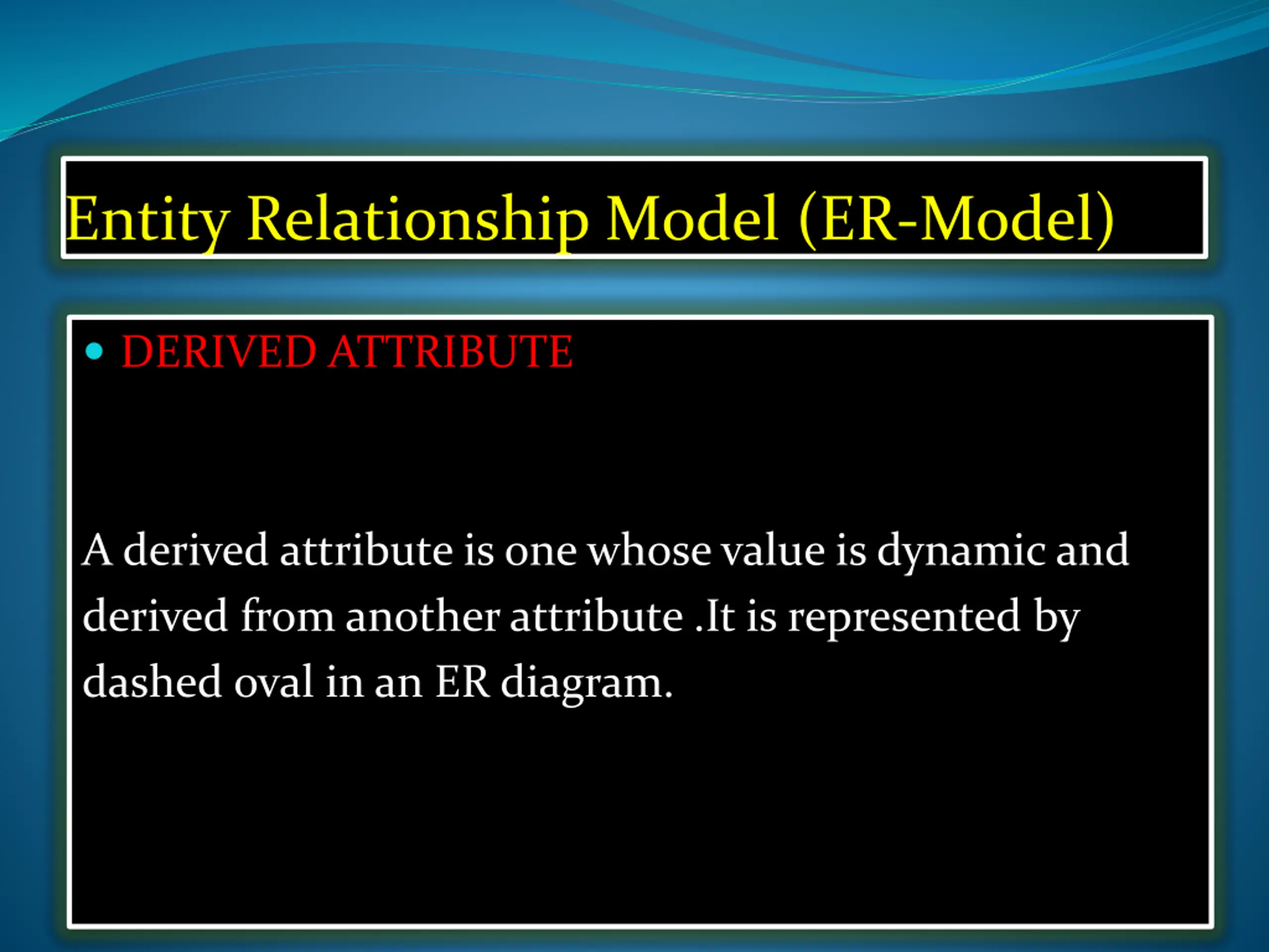 Entity Relationship Model (ER-Model) DERIVED ATTRIBUTE A derived attribute is one whose value is dynamic and derived from another attribute .It is represented by dashed oval in an ER diagram.