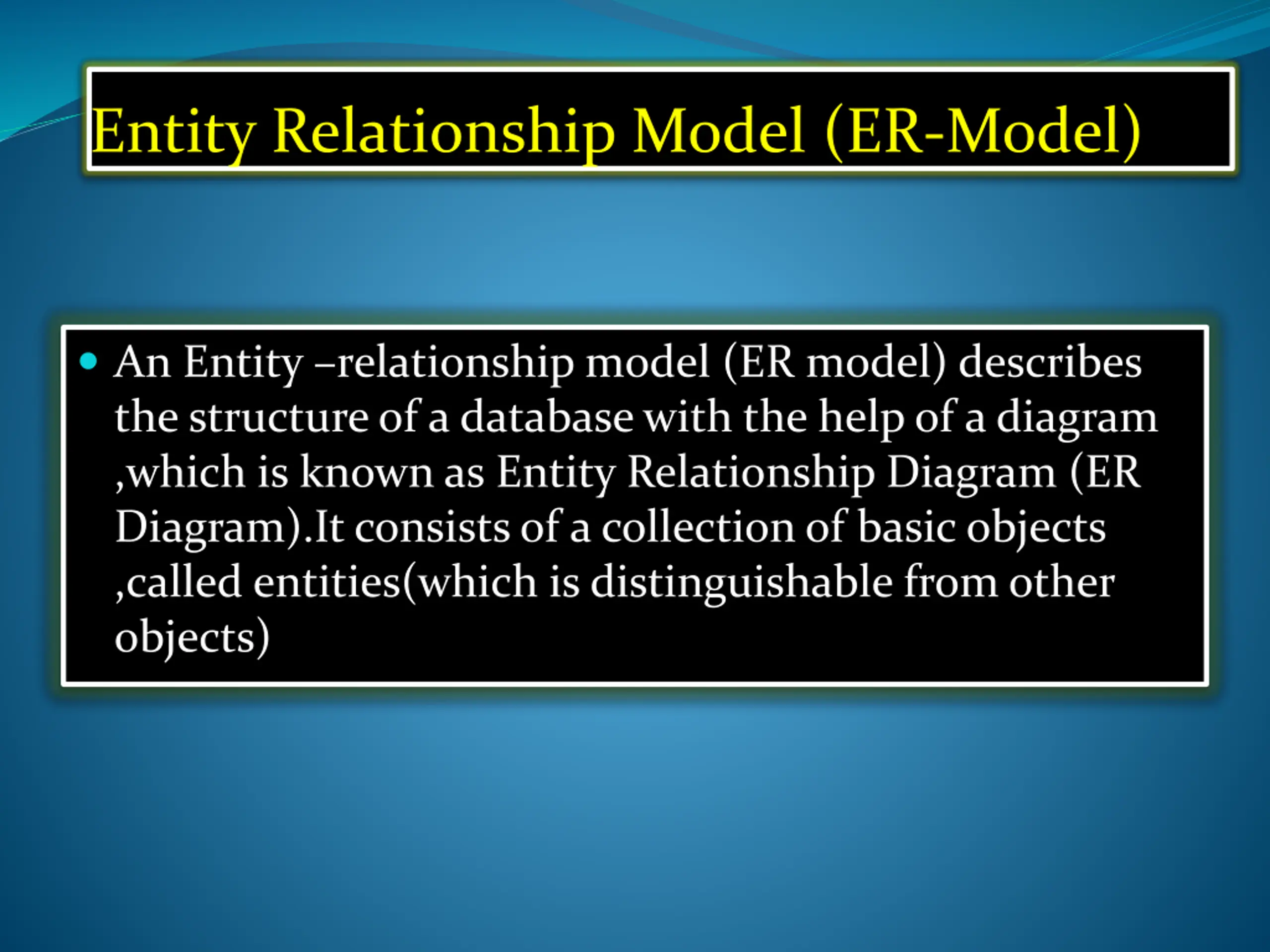 Entity Relationship Model (ER-Model) An Entity relationship model (ER model) describes the structure of a database with the help of a diagram ,which is known as Entity Relationship Diagram (ER Diagram).It consists of a collection of basic objects ,called entities(which is distinguishable from other objects)