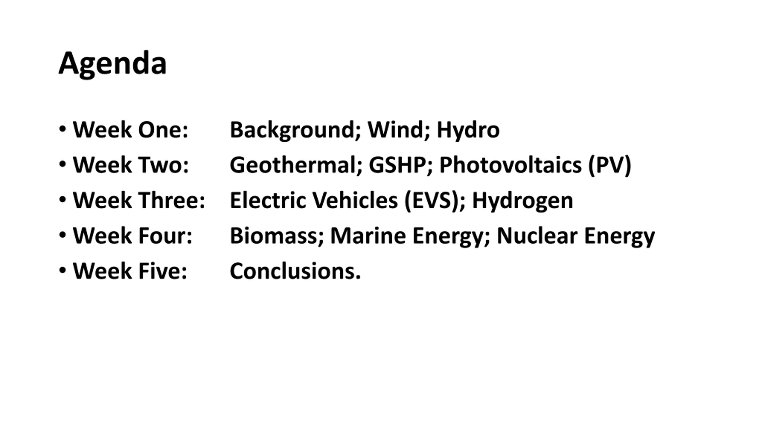 Agenda Week One: Week Two: Week Three: Electric Vehicles (EVS); Hydrogen Week Four: Biomass; Marine Energy; Nuclear Energy Week Five: Conclusions. Background; Wind; Hydro Geothermal; GSHP; Photovoltaics (PV)