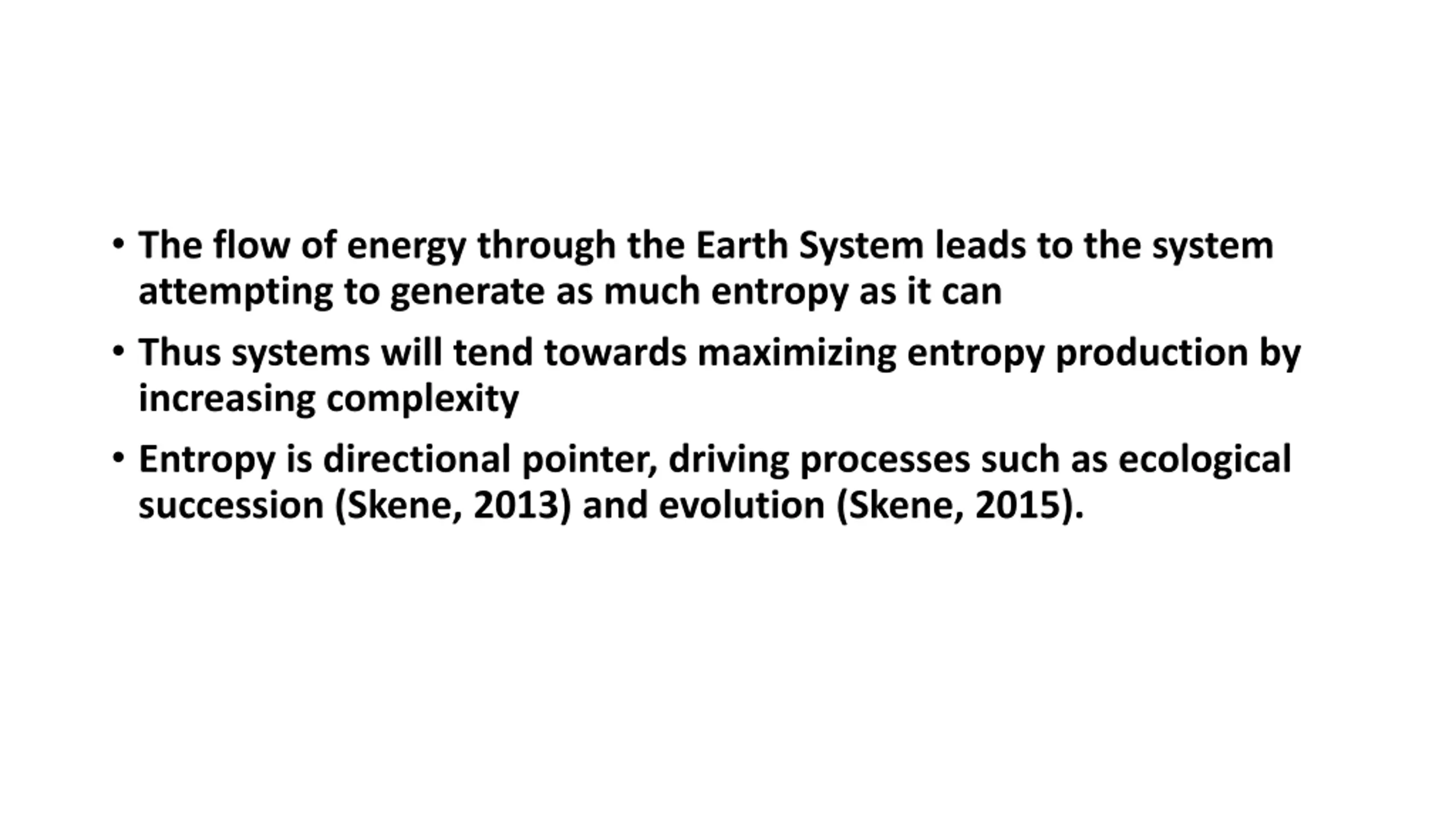 The flow of energy through the Earth System leads to the system attempting to generate as much entropy as it can Thus systems will tend towards maximizing entropy production by increasing complexity Entropy is directional pointer, driving processes such as ecological succession (Skene, 2013) and evolution (Skene, 2015).