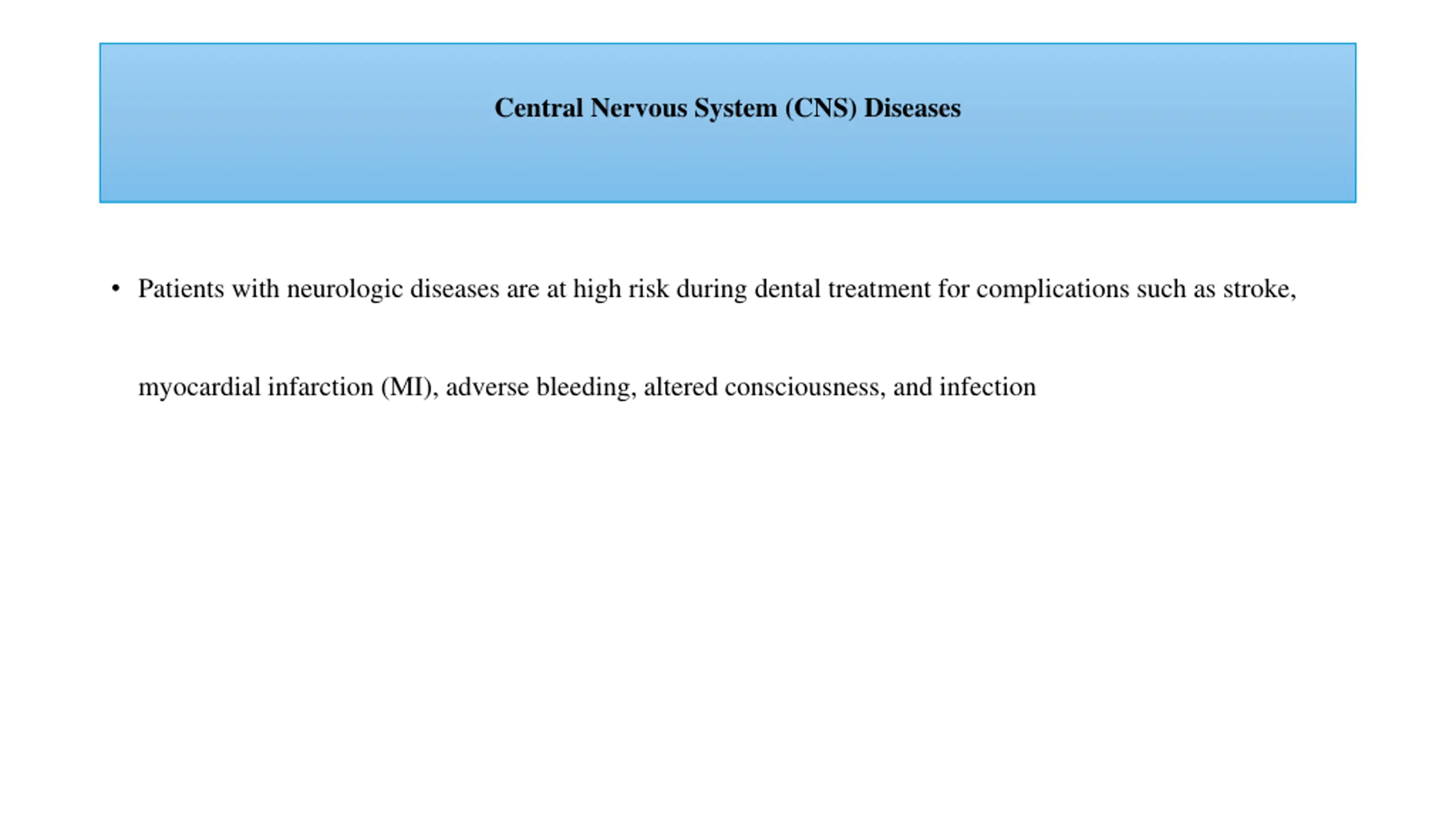Central Nervous System (CNS) Diseases Patients with neurologic diseases are at high risk during dental treatment for complications such as stroke, myocardial infarction (MI), adverse bleeding, altered consciousness, and infection