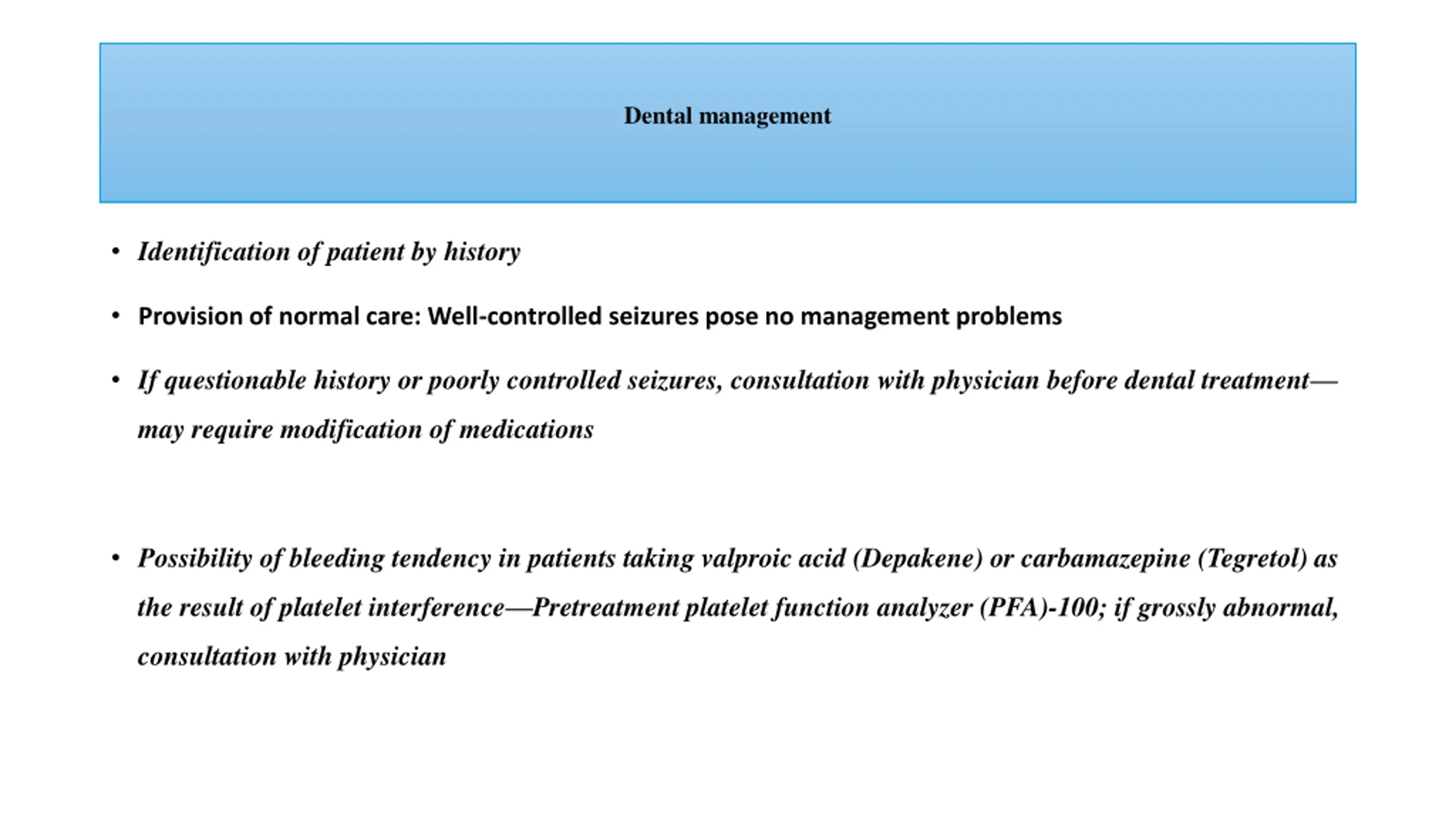 Dental management Identification of patient by history Provision of normal care: Well-controlled seizures pose no management problems If questionable history or poorly controlled seizures, consultation with physician before dental treatment may require modification of medications Possibility of bleeding tendency in patients taking valproic acid (Depakene) or carbamazepine (Tegretol) as the result of platelet interference Pretreatment platelet function analyzer (PFA)-100; if grossly abnormal, consultation with physician