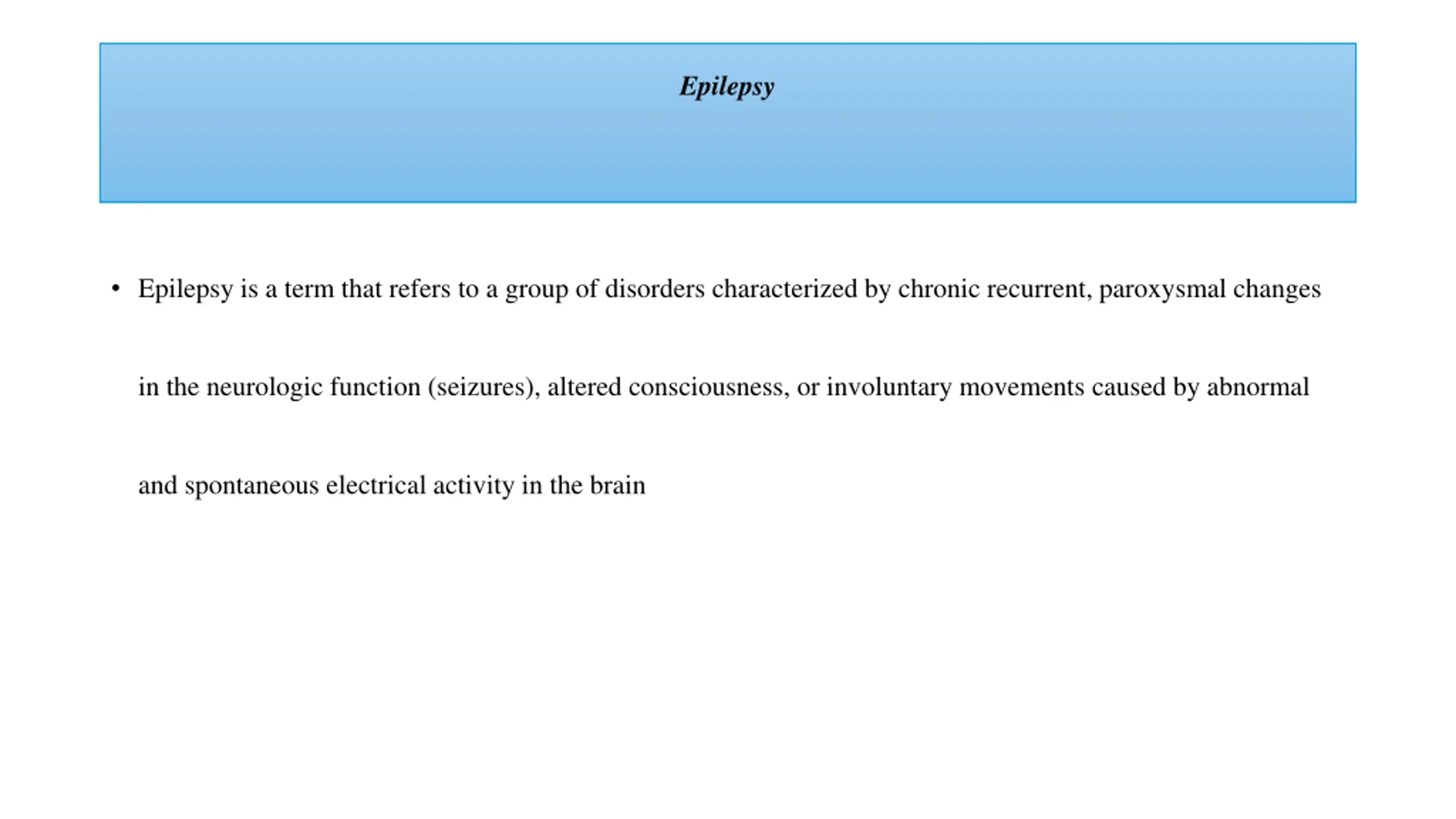 Epilepsy Epilepsy is a term that refers to a group of disorders characterized by chronic recurrent, paroxysmal changes in the neurologic function (seizures), altered consciousness, or involuntary movements caused by abnormal and spontaneous electrical activity in the brain
