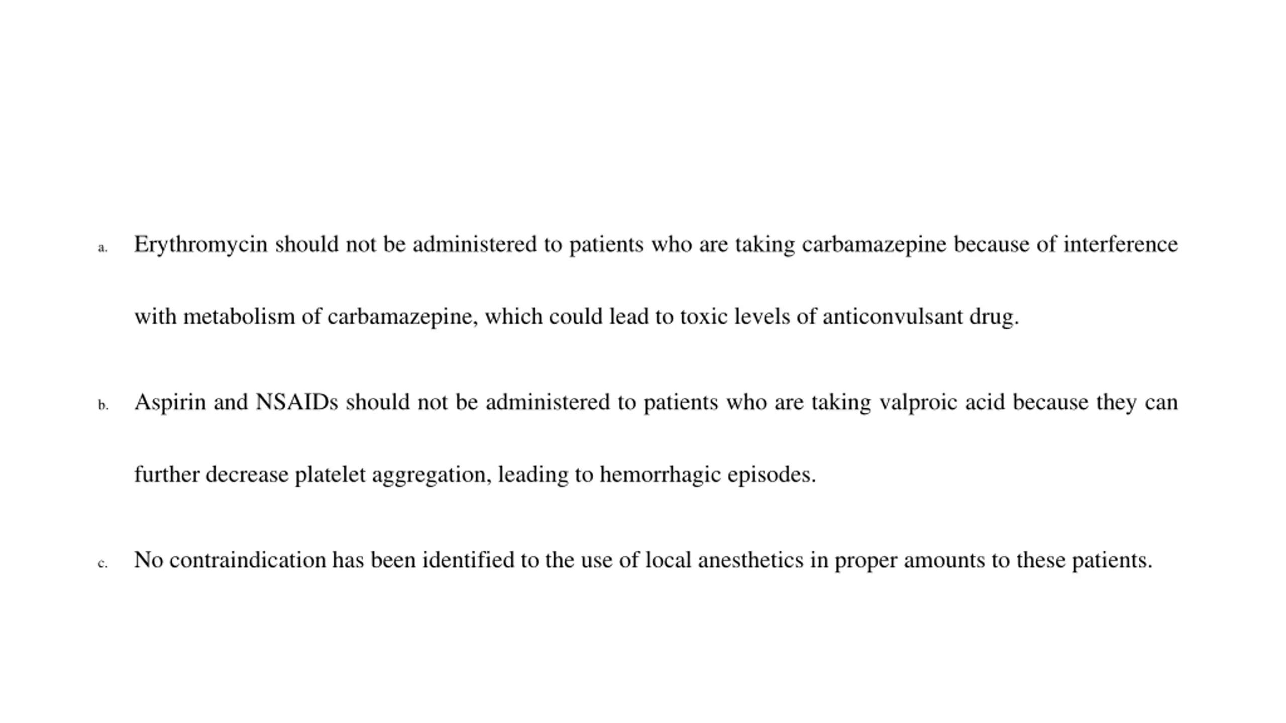 Erythromycin should not be administered to patients who are taking carbamazepine because of interference a. with metabolism of carbamazepine, which could lead to toxic levels of anticonvulsant drug. Aspirin and NSAIDs should not be administered to patients who are taking valproic acid because they can b. further decrease platelet aggregation, leading to hemorrhagic episodes. No contraindication has been identified to the use of local anesthetics in proper amounts to these patients. c.