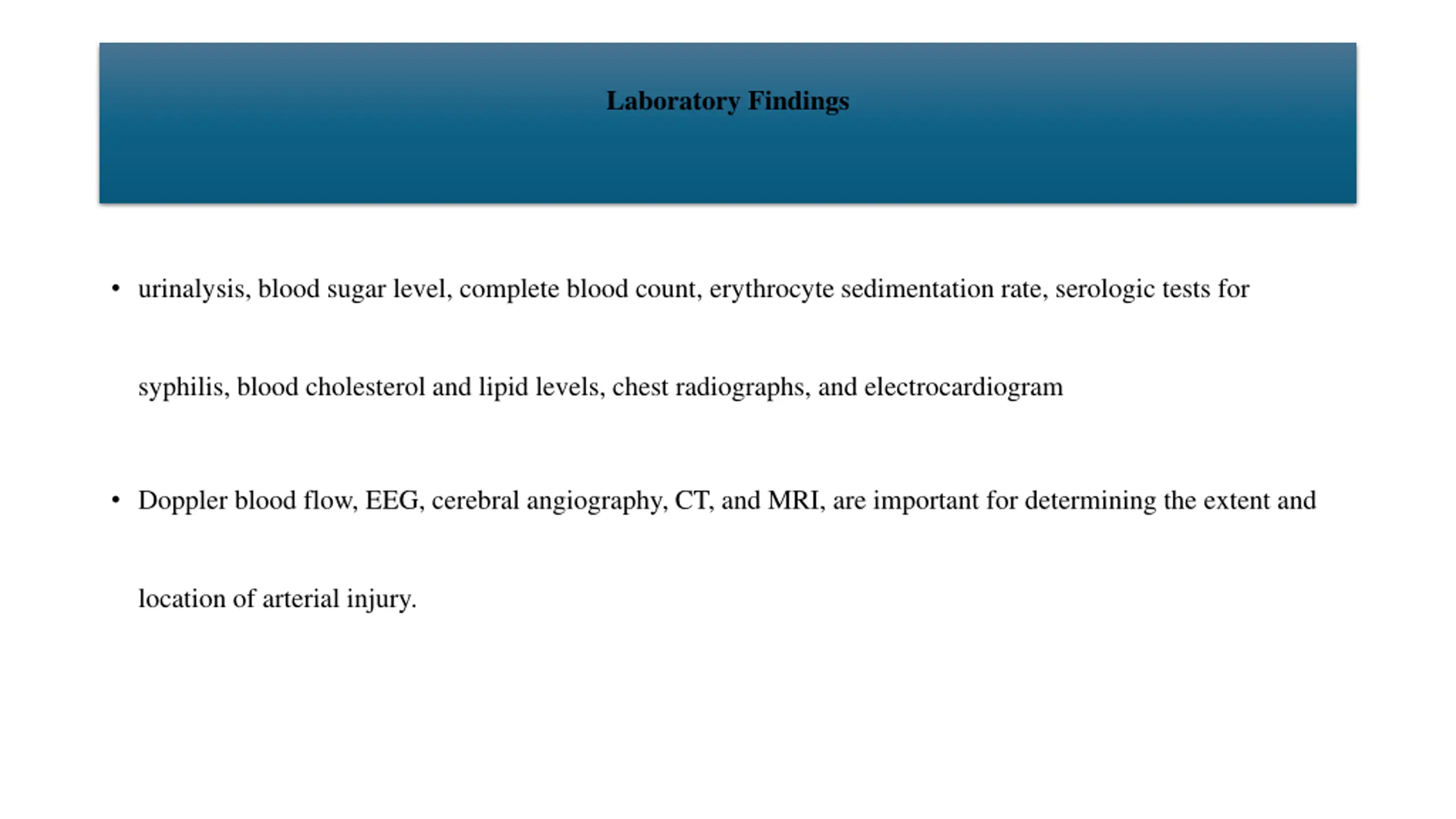 Laboratory Findings urinalysis, blood sugar level, complete blood count, erythrocyte sedimentation rate, serologic tests for syphilis, blood cholesterol and lipid levels, chest radiographs, and electrocardiogram Doppler blood flow, EEG, cerebral angiography, CT, and MRI, are important for determining the extent and location of arterial injury.