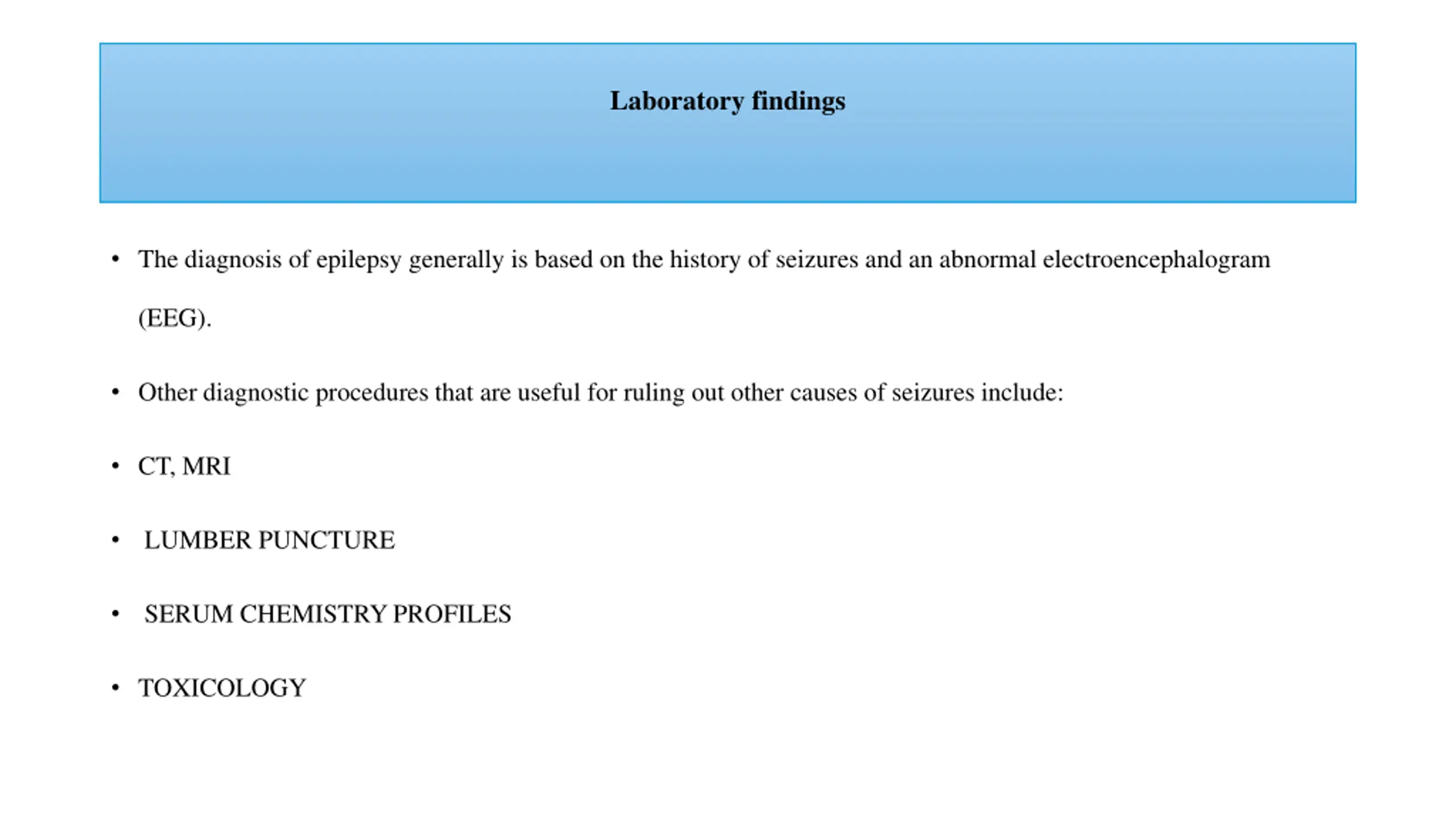 Laboratory findings The diagnosis of epilepsy generally is based on the history of seizures and an abnormal electroencephalogram (EEG). Other diagnostic procedures that are useful for ruling out other causes of seizures include: CT, MRI LUMBER PUNCTURE SERUM CHEMISTRY PROFILES TOXICOLOGY
