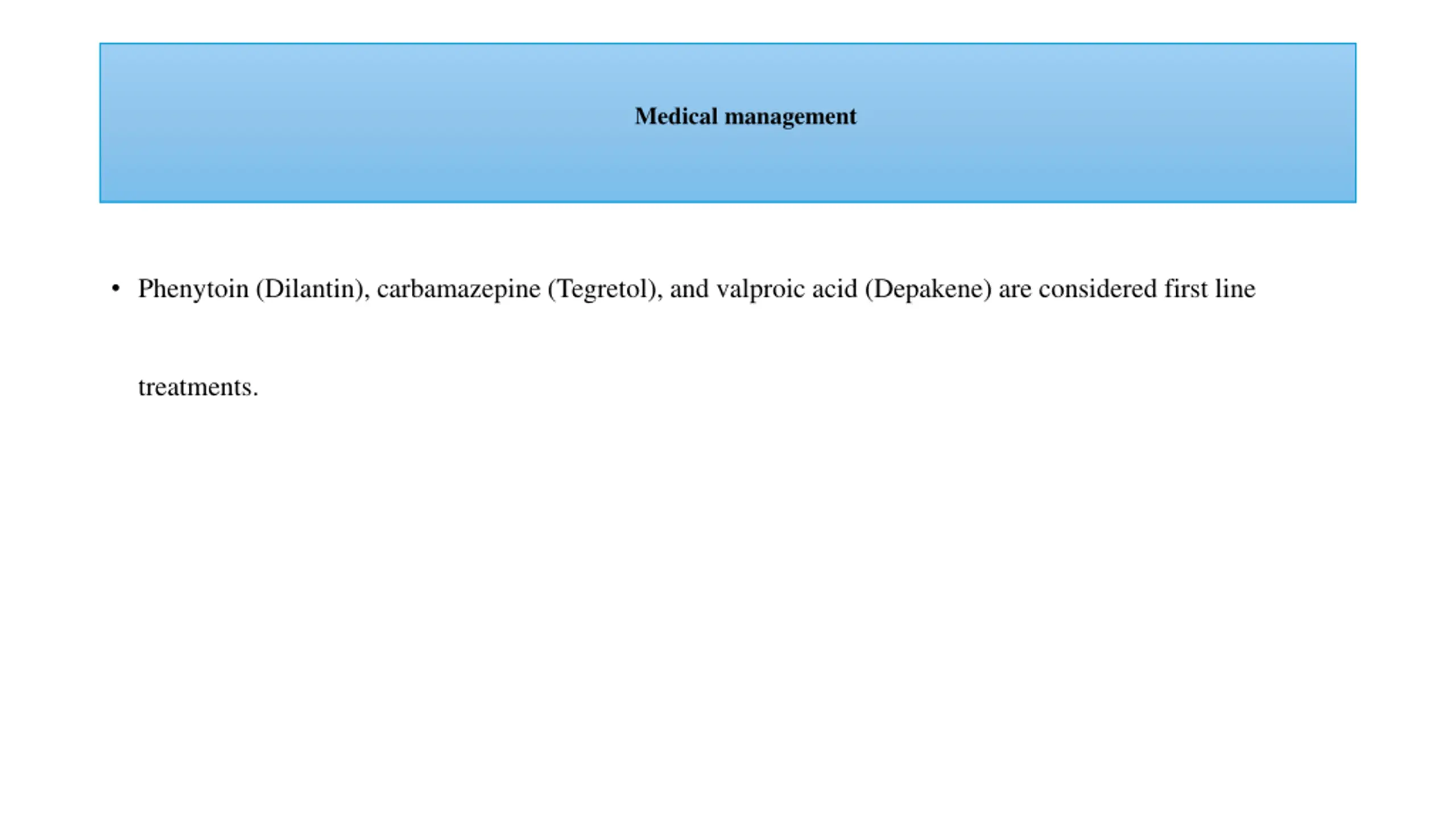 Medical management Phenytoin (Dilantin), carbamazepine (Tegretol), and valproic acid (Depakene) are considered first line treatments.