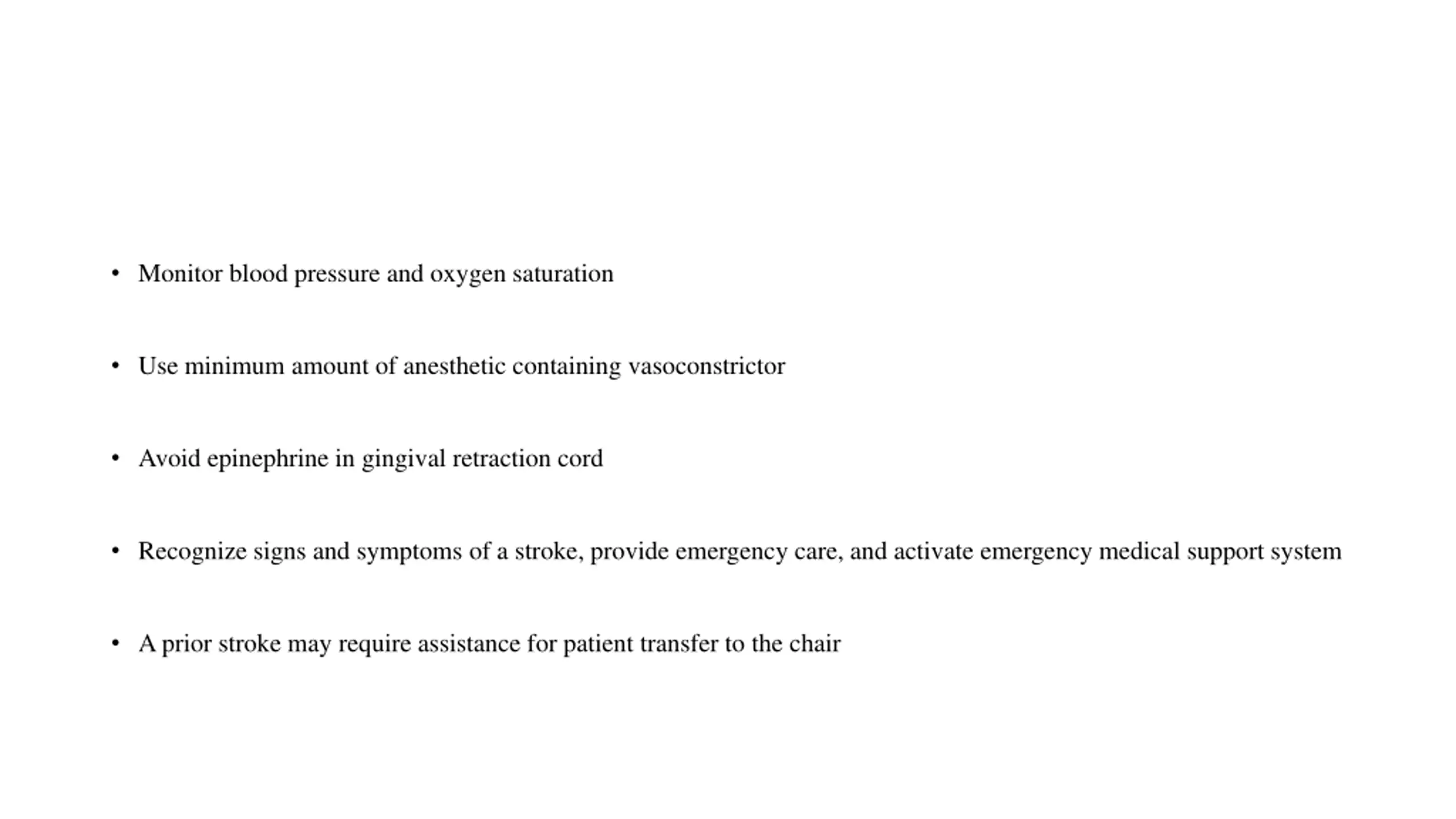 Monitor blood pressure and oxygen saturation Use minimum amount of anesthetic containing vasoconstrictor Avoid epinephrine in gingival retraction cord Recognize signs and symptoms of a stroke, provide emergency care, and activate emergency medical support system A prior stroke may require assistance for patient transfer to the chair