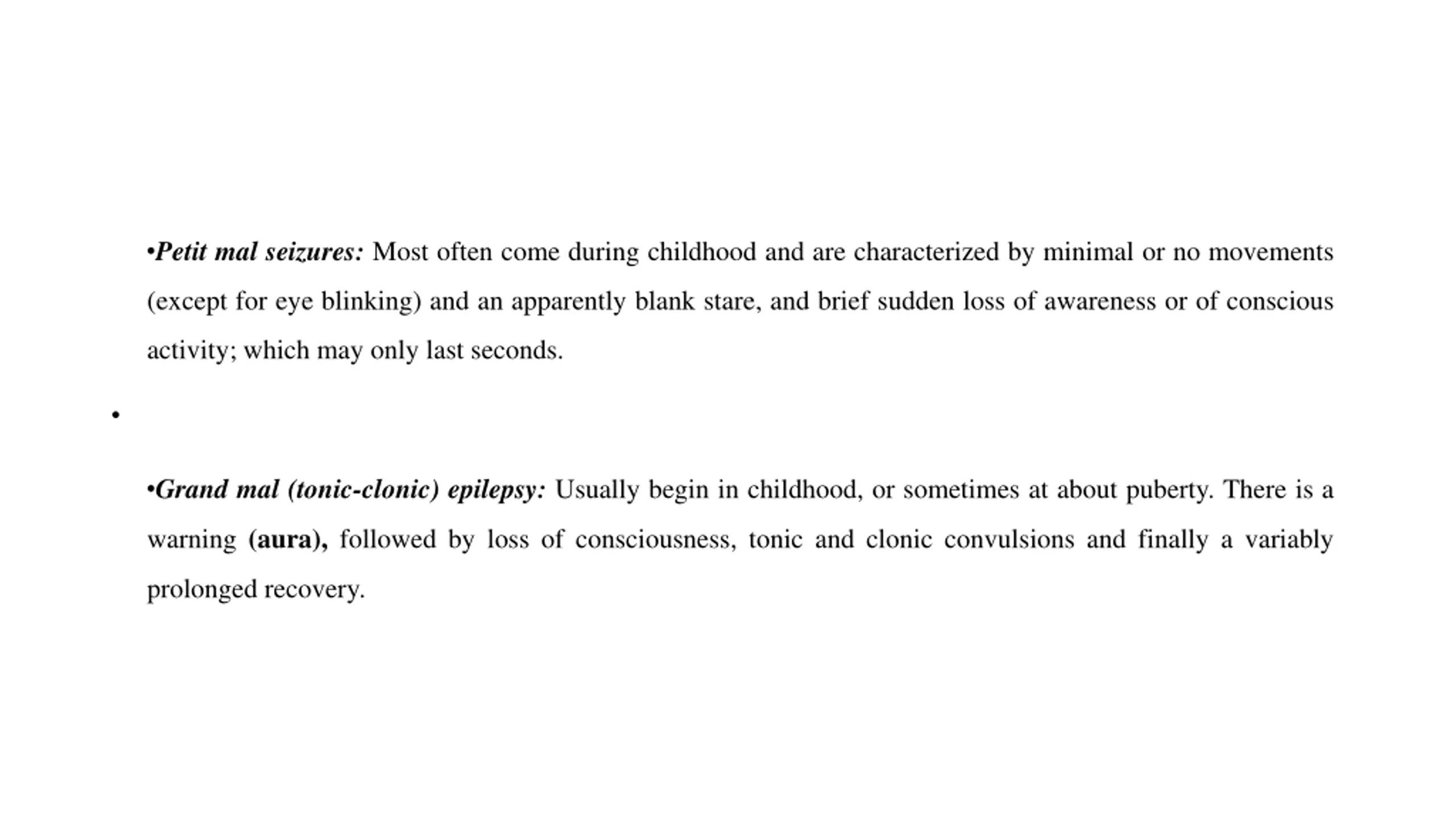 Petit mal seizures: Most often come during childhood and are characterized by minimal or no movements (except for eye blinking) and an apparently blank stare, and brief sudden loss of awareness or of conscious activity; which may only last seconds. Grand mal (tonic-clonic) epilepsy: Usually begin in childhood, or sometimes at about puberty. There is a warning (aura), followed by loss of consciousness, tonic and clonic convulsions and finally a variably prolonged recovery.
