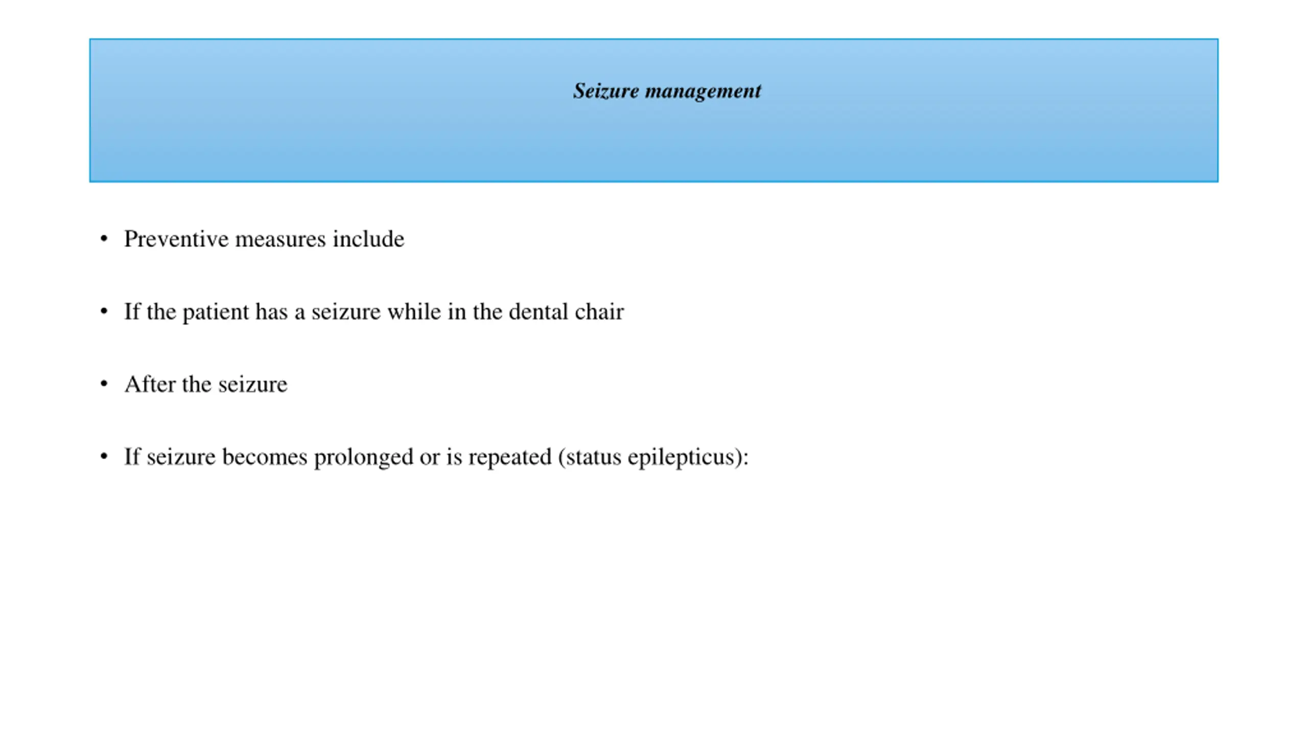 Seizure management Preventive measures include If the patient has a seizure while in the dental chair After the seizure If seizure becomes prolonged or is repeated (status epilepticus):