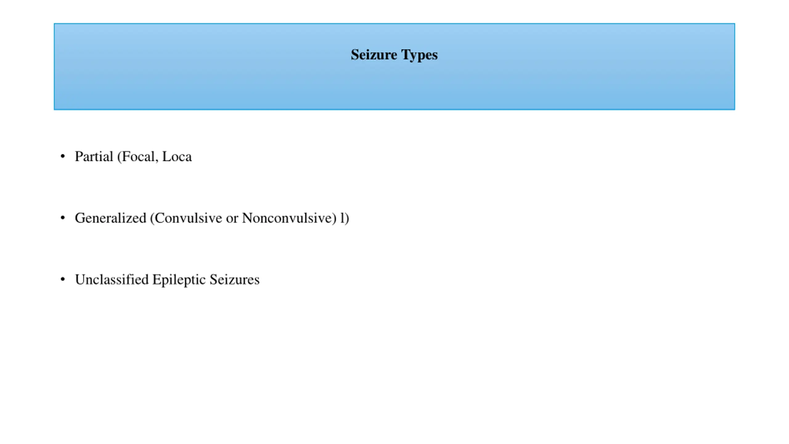 Seizure Types Partial (Focal, Loca Generalized (Convulsive or Nonconvulsive) l) Unclassified Epileptic Seizures