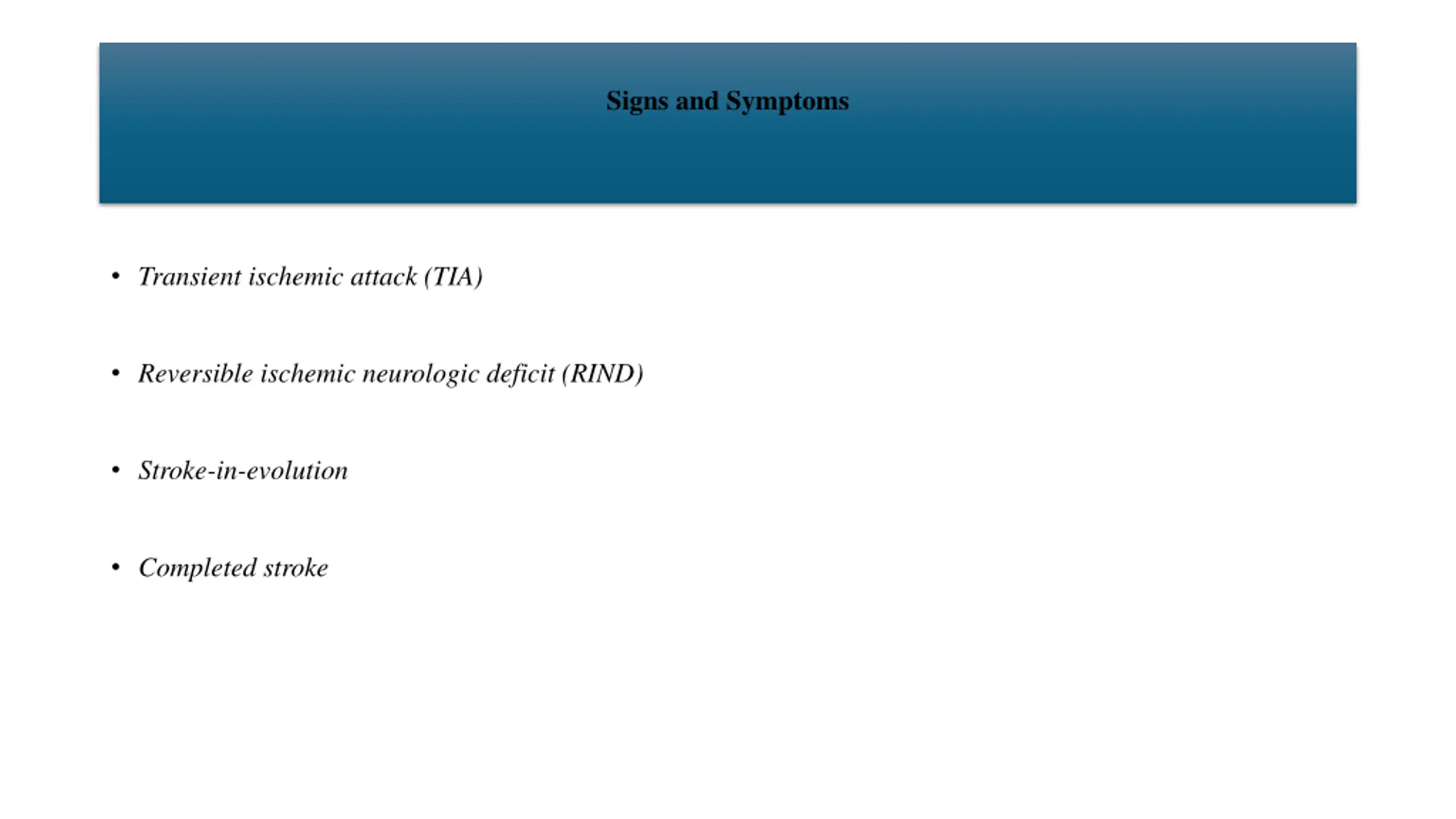 Signs and Symptoms Transient ischemic attack (TIA) Reversible ischemic neurologic deficit (RIND) Stroke-in-evolution Completed stroke
