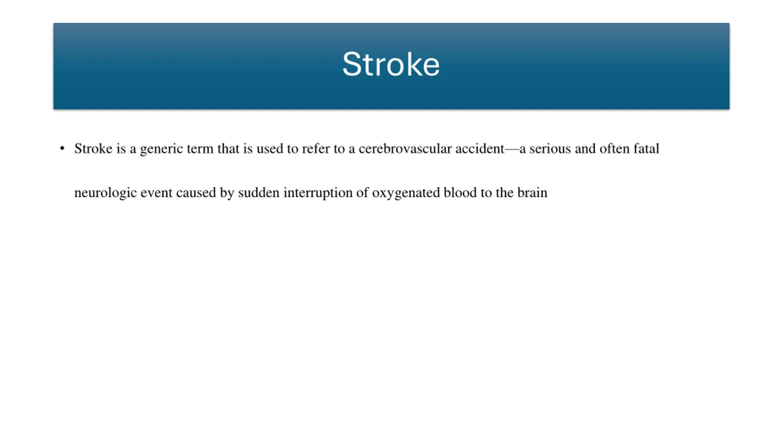 Stroke Stroke is a generic term that is used to refer to a cerebrovascular accident a serious and often fatal neurologic event caused by sudden interruption of oxygenated blood to the brain
