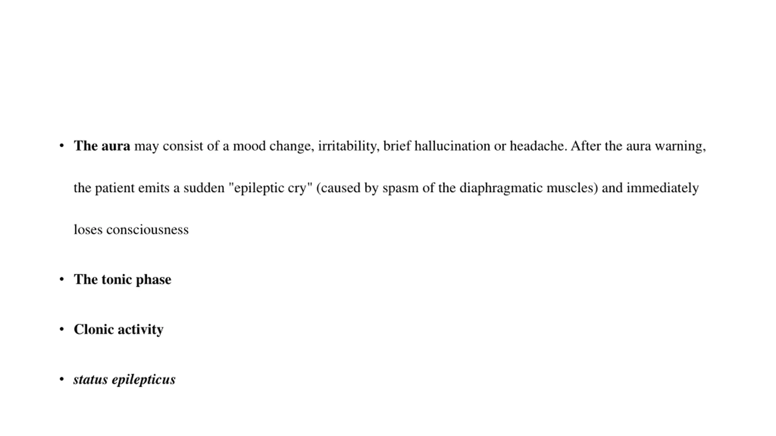 The aura may consist of a mood change, irritability, brief hallucination or headache. After the aura warning, the patient emits a sudden "epileptic cry" (caused by spasm of the diaphragmatic muscles) and immediately loses consciousness The tonic phase Clonic activity status epilepticus