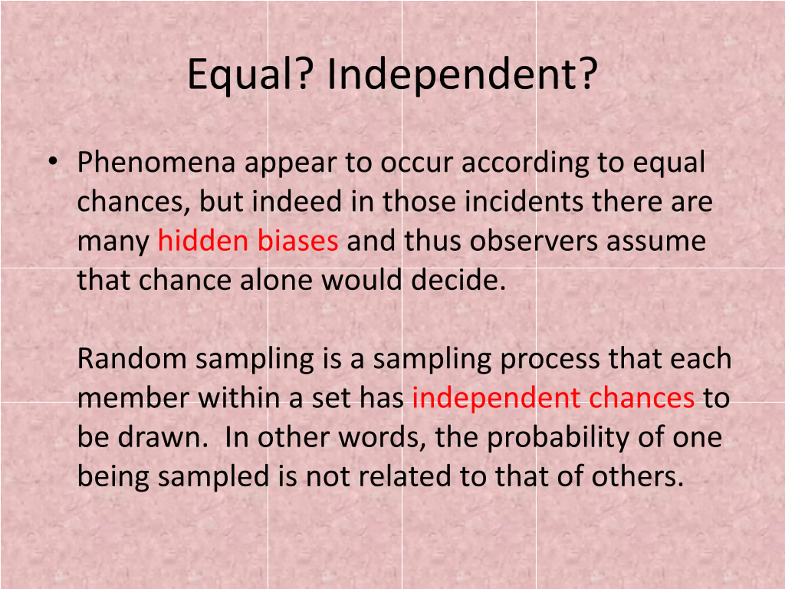 Equal? Independent? Phenomena appear to occur according to equal chances, but indeed in those incidents there are many hidden biases and thus observers assume that chance alone would decide. Random sampling is a sampling process that each member within a set has independent chances to be drawn. In other words, the probability of one being sampled is not related to that of others.