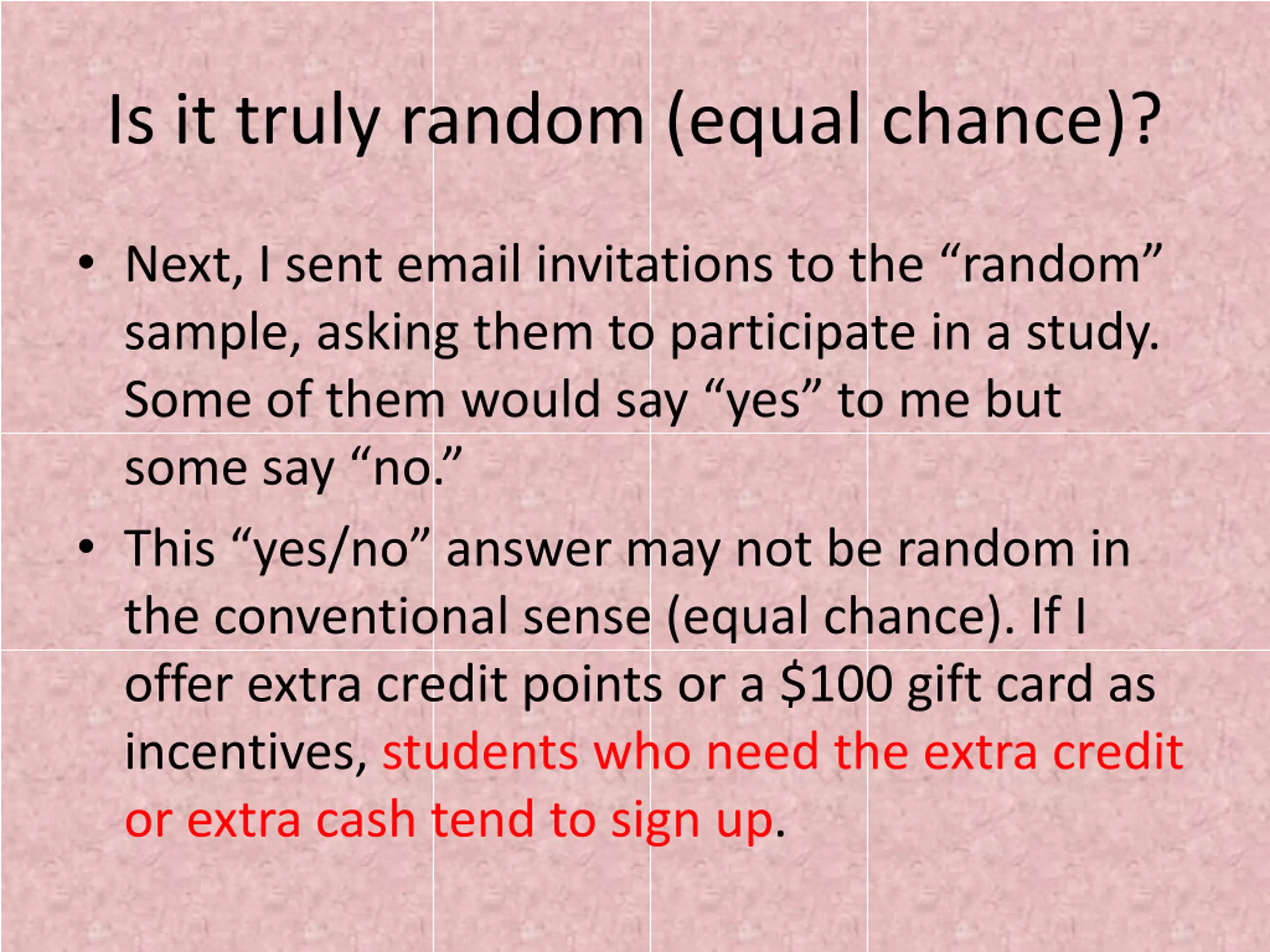 Is it truly random (equal chance)? Next, I sent email invitations to the random sample, asking them to participate in a study. Some of them would say yes to me but some say no. This yes/no answer may not be random in the conventional sense (equal chance). If I offer extra credit points or a $100 gift card as incentives, students who need the extra credit or extra cash tend to sign up.