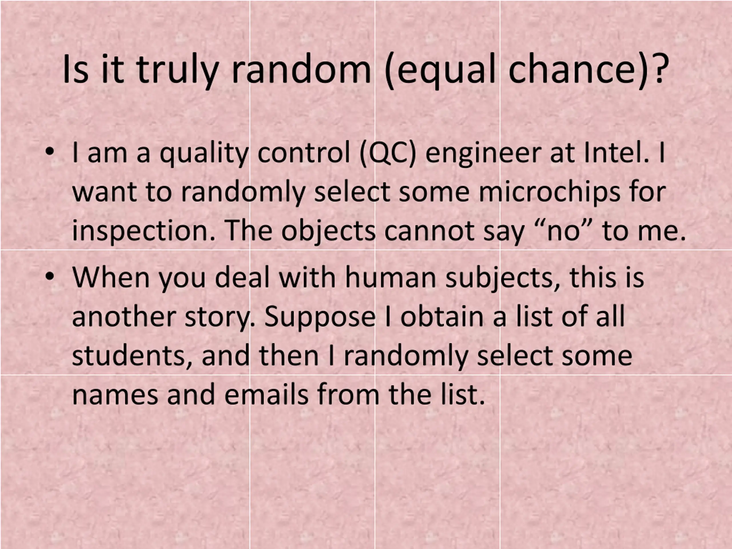 Is it truly random (equal chance)? I am a quality control (QC) engineer at Intel. I want to randomly select some microchips for inspection. The objects cannot say no to me. When you deal with human subjects, this is another story. Suppose I obtain a list of all students, and then I randomly select some names and emails from the list.