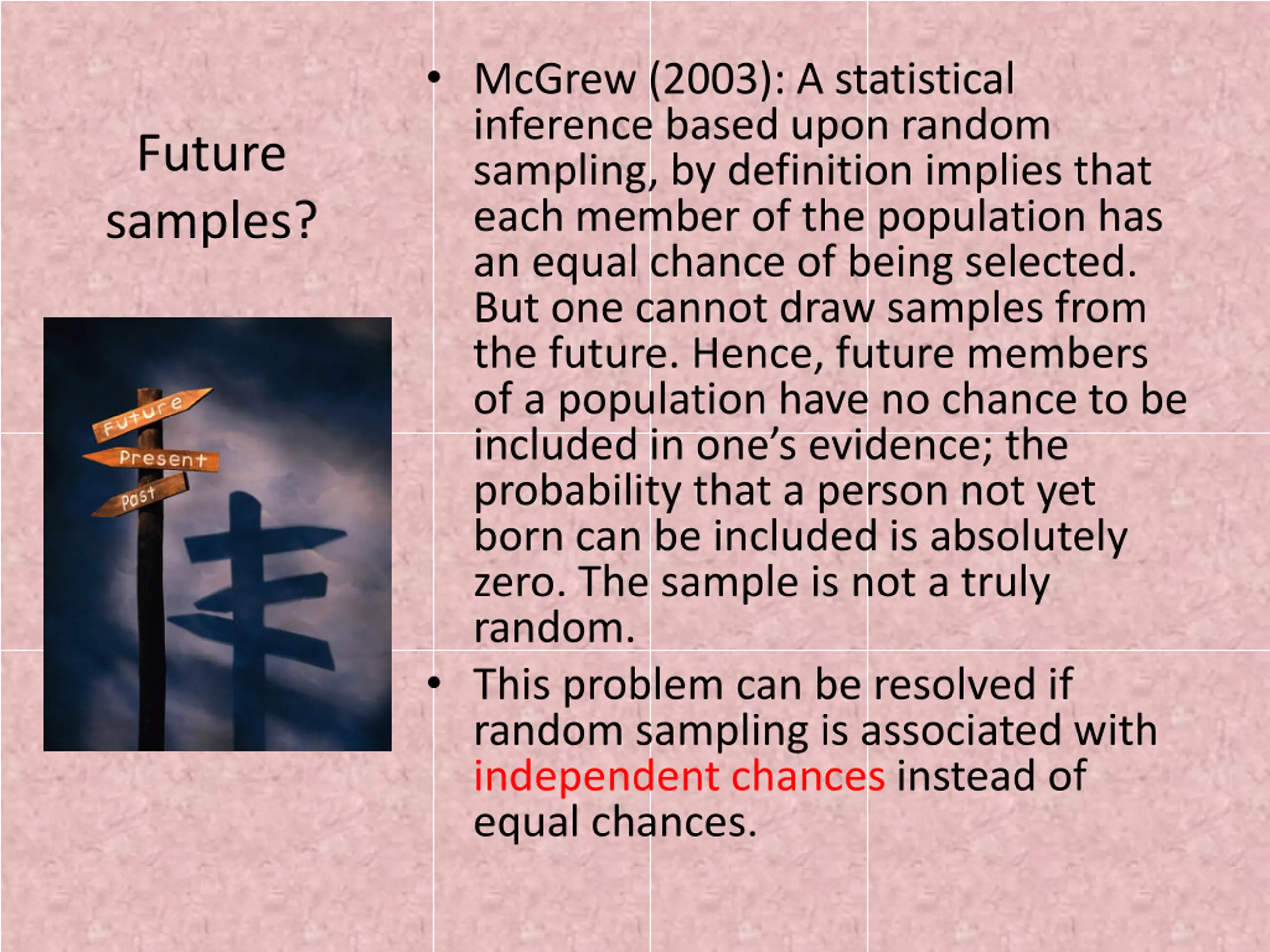 McGrew (2003): A statistical inference based upon random sampling, by definition implies that each member of the population has an equal chance of being selected. But one cannot draw samples from the future. Hence, future members of a population have no chance to be included in one s evidence; the probability that a person not yet born can be included is absolutely zero. The sample is not a truly random. This problem can be resolved if random sampling is associated with independent chances instead of equal chances. Future samples?