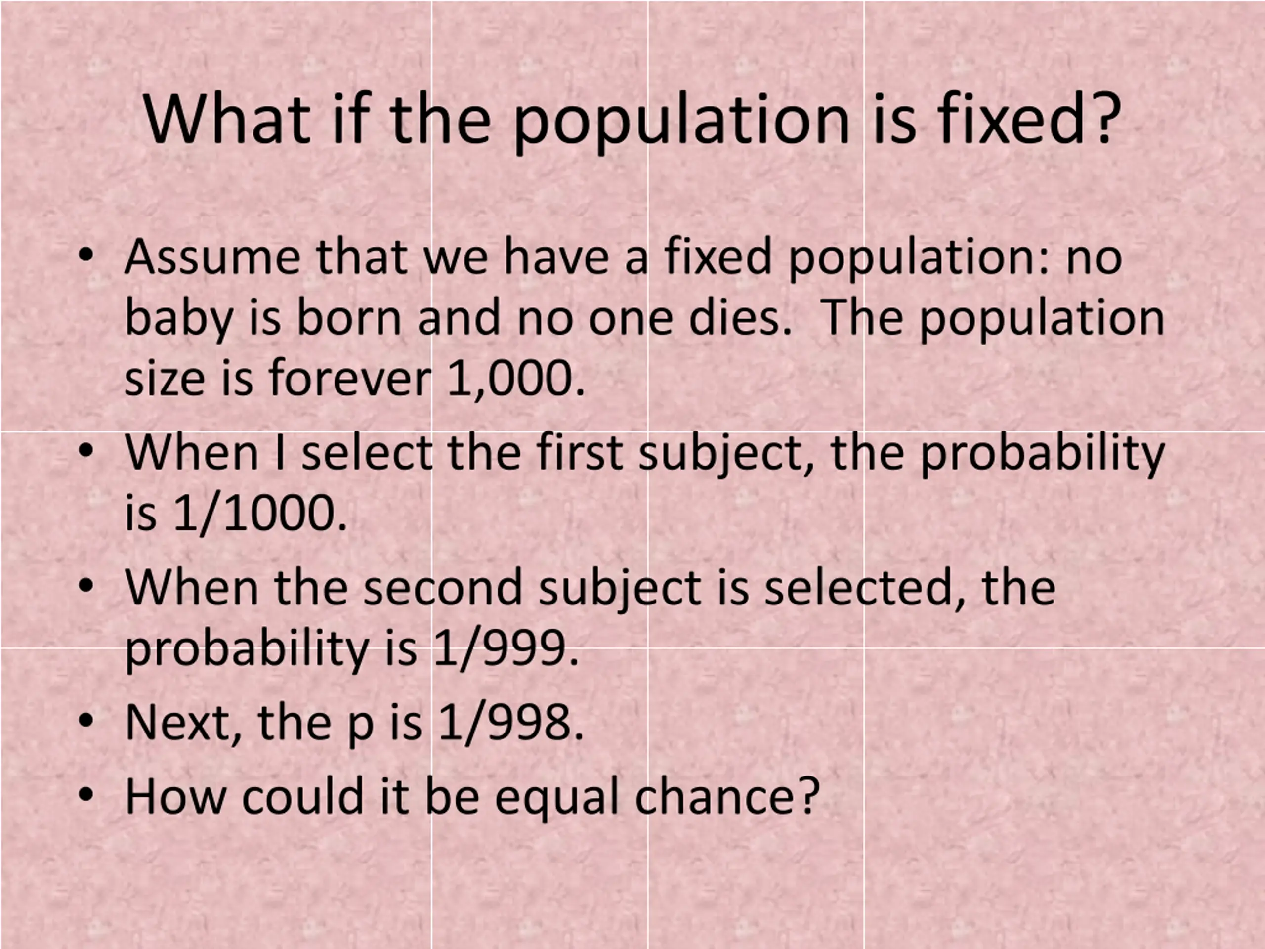 What if the population is fixed? Assume that we have a fixed population: no baby is born and no one dies. The population size is forever 1,000. When I select the first subject, the probability is 1/1000. When the second subject is selected, the probability is 1/999. Next, the p is 1/998. How could it be equal chance?