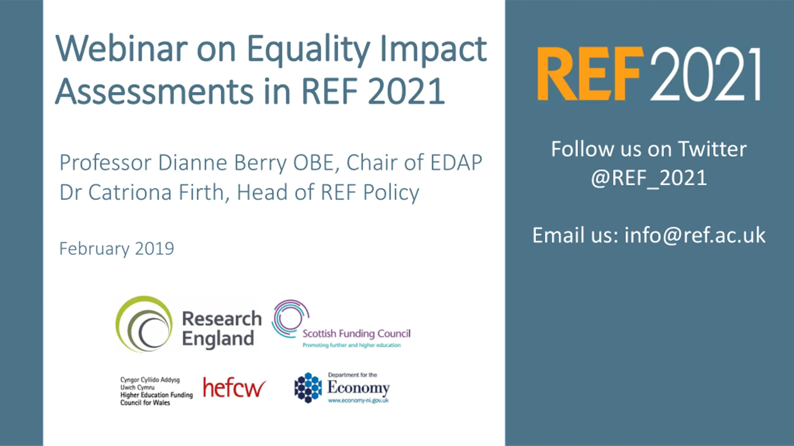 Webinar on Equality Impact Webinar on Equality Impact Assessments in REF 2021 Assessments in REF 2021 Follow us on Twitter @REF_2021 Professor Dianne Berry OBE, Chair of EDAP Dr Catriona Firth, Head of REF Policy Email us: info@ref.ac.uk February 2019