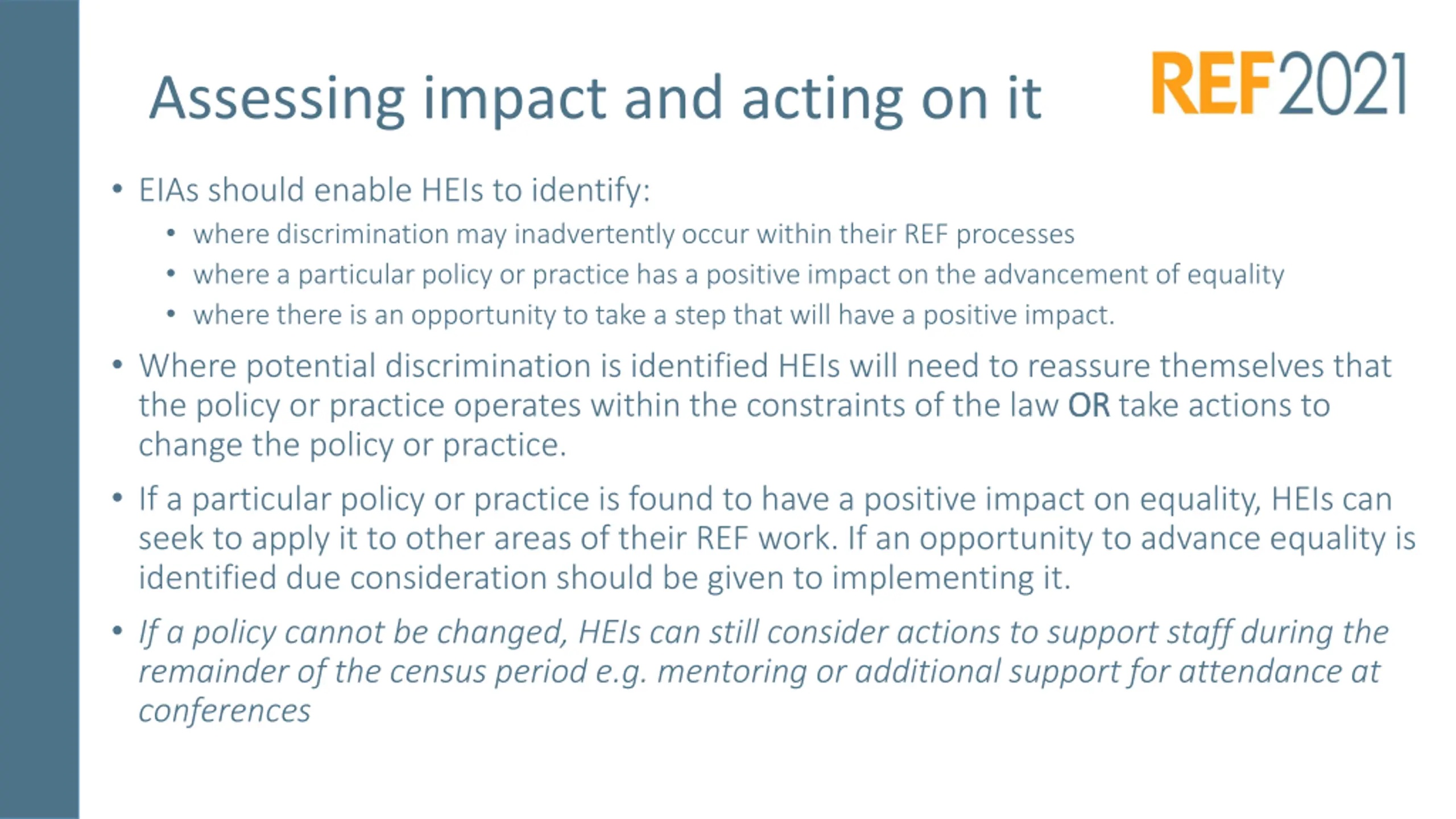 Assessing impact and acting on it EIAs should enable HEIs to identify: where discrimination may inadvertently occur within their REF processes where a particular policy or practice has a positive impact on the advancement of equality where there is an opportunity to take a step that will have a positive impact. Where potential discrimination is identified HEIs will need to reassure themselves that the policy or practice operates within the constraints of the law OR change the policy or practice. If a particular policy or practice is found to have a positive impact on equality, HEIs can seek to apply it to other areas of their REF work. If an opportunity to advance equality is identified due consideration should be given to implementing it. If a policy cannot be changed, HEIs can still consider actions to support staff during the remainder of the census period e.g. mentoring or additional support for attendance at conferences OR take actions to