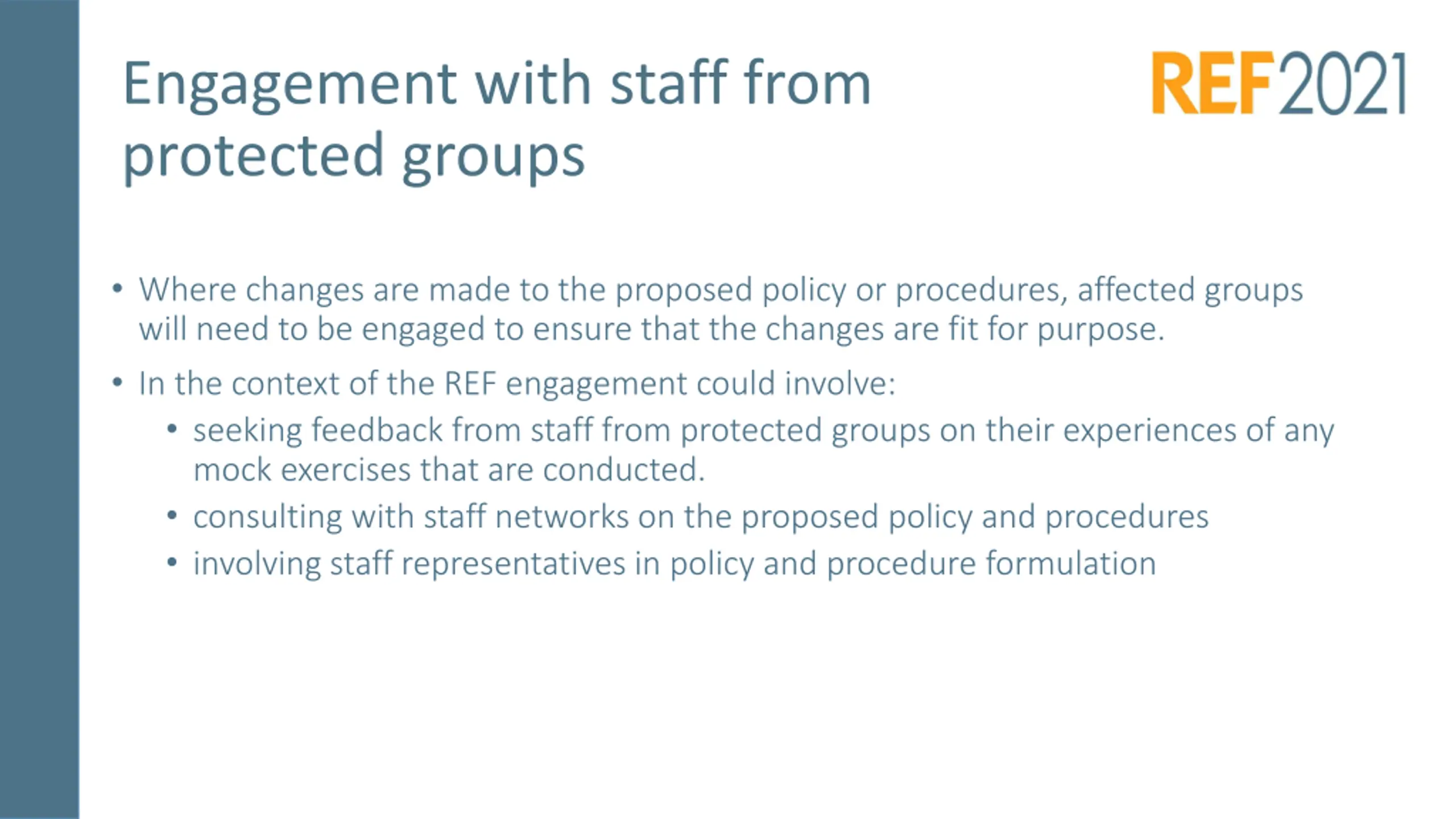 Engagement with staff from protected groups Where changes are made to the proposed policy or procedures, affected groups will need to be engaged to ensure that the changes are fit for purpose. In the context of the REF engagement could involve: seeking feedback from staff from protected groups on their experiences of any mock exercises that are conducted. consulting with staff networks on the proposed policy and procedures involving staff representatives in policy and procedure formulation