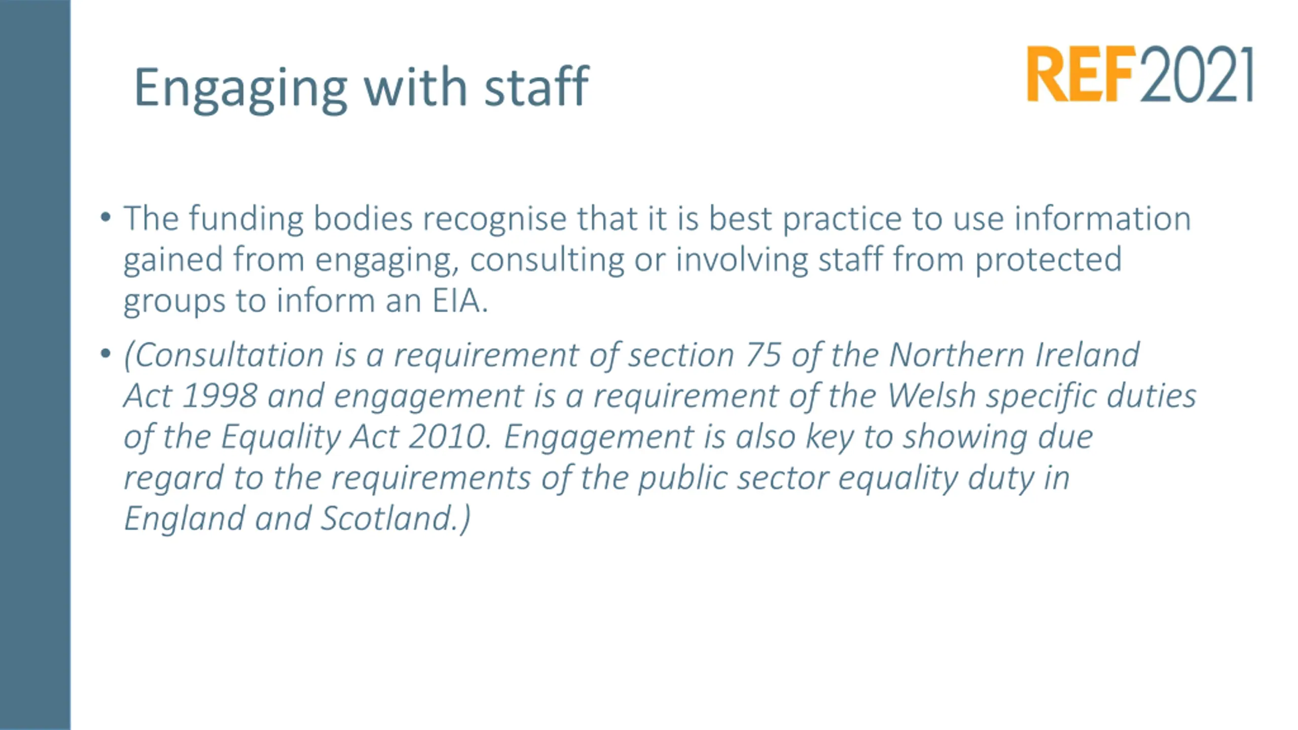 Engaging with staff The funding bodies recognise that it is best practice to use information gained from engaging, consulting or involving staff from protected groups to inform an EIA. (Consultation is a requirement of section 75 of the Northern Ireland Act 1998 and engagement is a requirement of the Welsh specific duties of the Equality Act 2010. Engagement is also key to showing due regard to the requirements of the public sector equality duty in England and Scotland.)