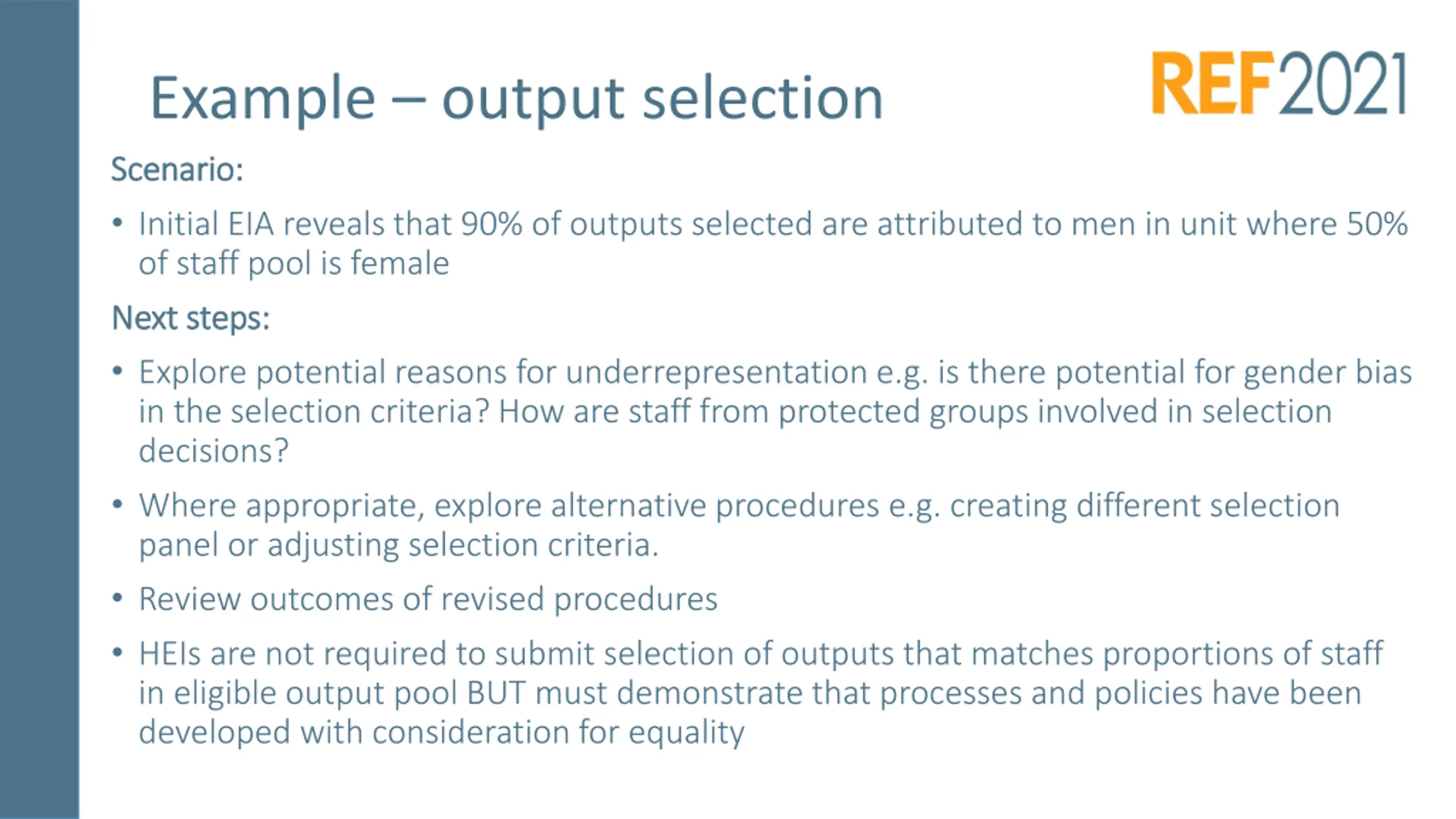 Example output selection Scenario: Scenario: Initial EIA reveals that 90% of outputs selected are attributed to men in unit where 50% of staff pool is female Next steps: Next steps: Explore potential reasons for underrepresentation e.g. is there potential for gender bias in the selection criteria? How are staff from protected groups involved in selection decisions? Where appropriate, explore alternative procedures e.g. creating different selection panel or adjusting selection criteria. Review outcomes of revised procedures HEIs are not required to submit selection of outputs that matches proportions of staff in eligible output pool BUT must demonstrate that processes and policies have been developed with consideration for equality