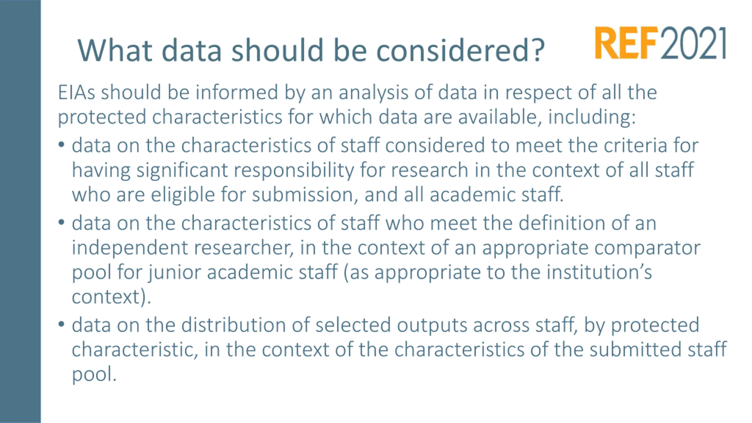 What data should be considered? EIAs should be informed by an analysis of data in respect of all the protected characteristics for which data are available, including: data on the characteristics of staff considered to meet the criteria for having significant responsibility for research in the context of all staff who are eligible for submission, and all academic staff. data on the characteristics of staff who meet the definition of an independent researcher, in the context of an appropriate comparator pool for junior academic staff (as appropriate to the institution s context). data on the distribution of selected outputs across staff, by protected characteristic, in the context of the characteristics of the submitted staff pool.