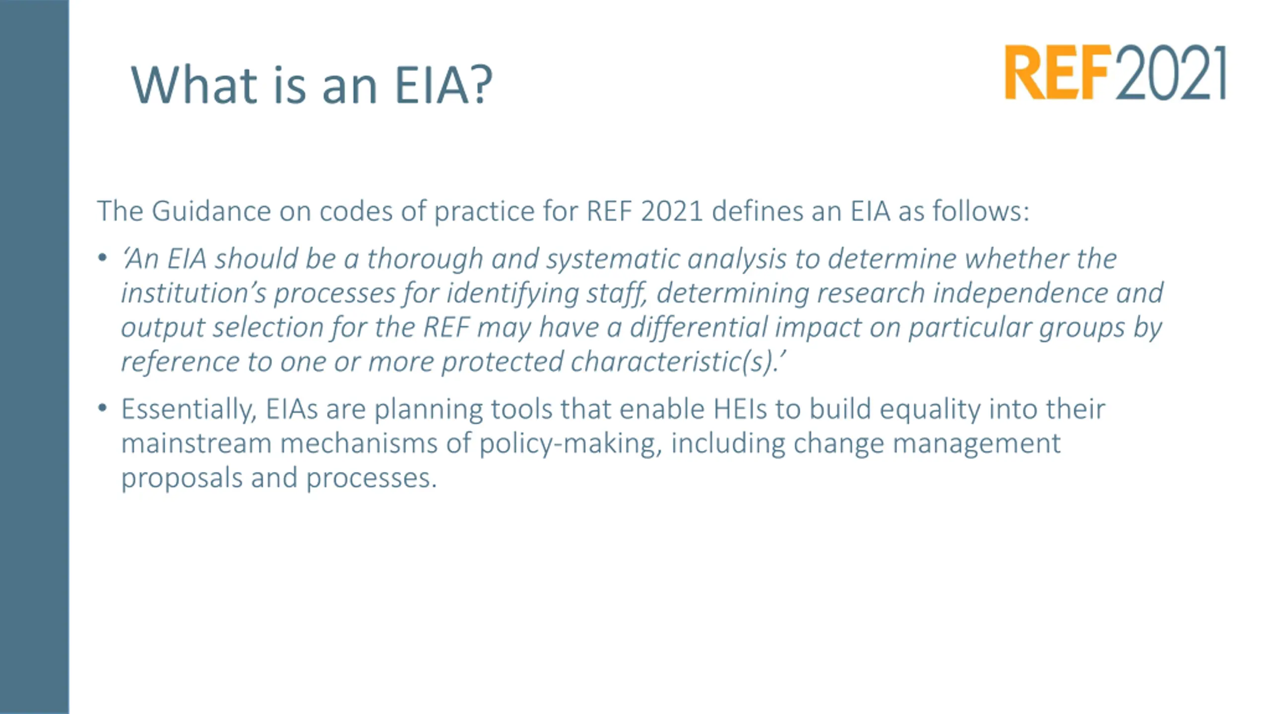 What is an EIA? The Guidance on codes of practice for REF 2021 defines an EIA as follows: An EIA should be a thorough and systematic analysis to determine whether the institution s processes for identifying staff, determining research independence and output selection for the REF may have a differential impact on particular groups by reference to one or more protected characteristic(s). Essentially, EIAs are planning tools that enable HEIs to build equality into their mainstream mechanisms of policy-making, including change management proposals and processes.