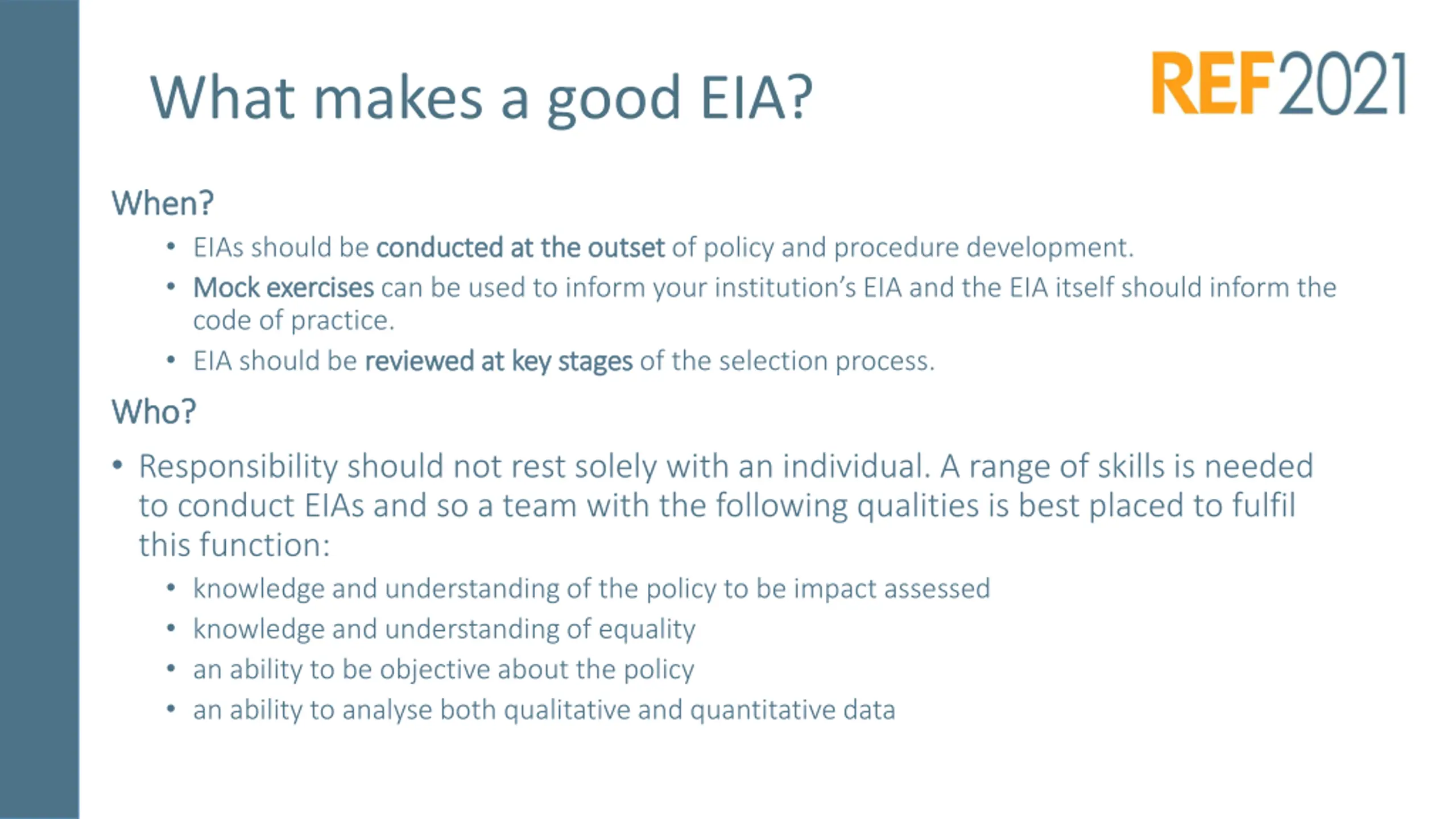 What makes a good EIA? When? When? EIAs should be conducted at the outset conducted at the outset of policy and procedure development. Mock exercises Mock exercises can be used to inform your institution s EIA and the EIA itself should inform the code of practice. EIA should be reviewed at key stages reviewed at key stages of the selection process. Who? Who? Responsibility should not rest solely with an individual. A range of skills is needed to conduct EIAs and so a team with the following qualities is best placed to fulfil this function: knowledge and understanding of the policy to be impact assessed knowledge and understanding of equality an ability to be objective about the policy an ability to analyse both qualitative and quantitative data