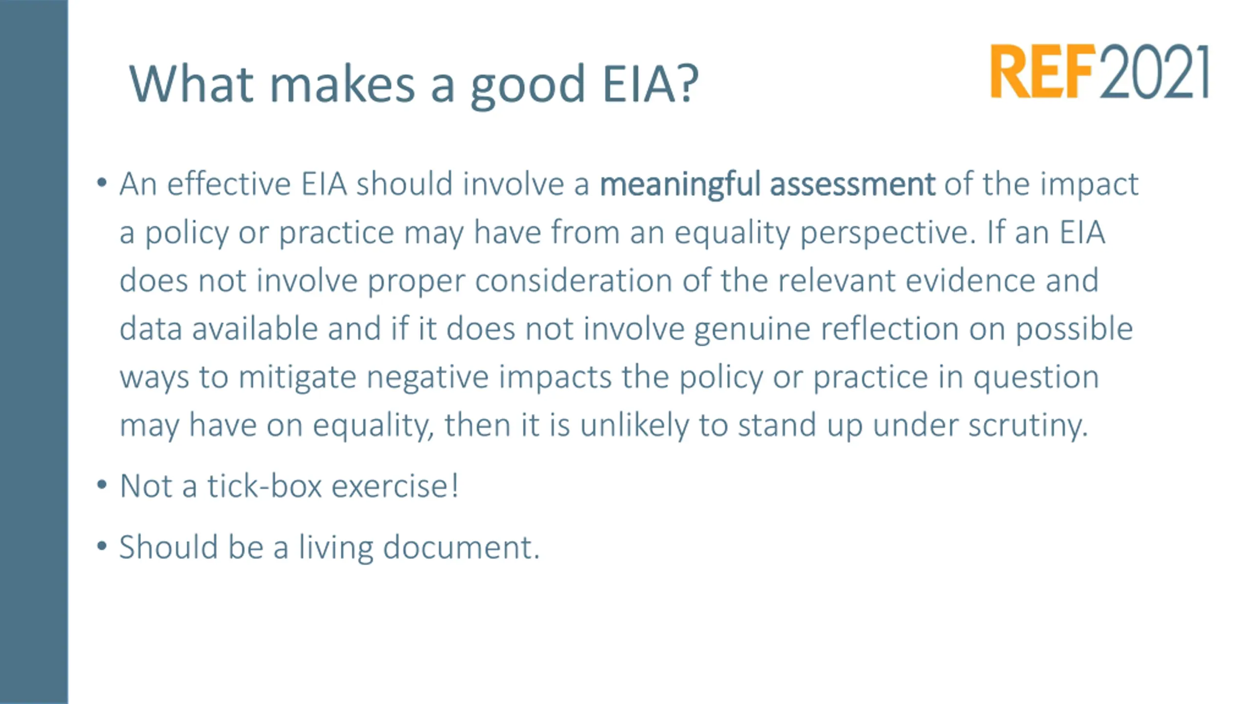 What makes a good EIA? An effective EIA should involve a meaningful assessment a policy or practice may have from an equality perspective. If an EIA does not involve proper consideration of the relevant evidence and data available and if it does not involve genuine reflection on possible ways to mitigate negative impacts the policy or practice in question may have on equality, then it is unlikely to stand up under scrutiny. meaningful assessment of the impact Not a tick-box exercise! Should be a living document.