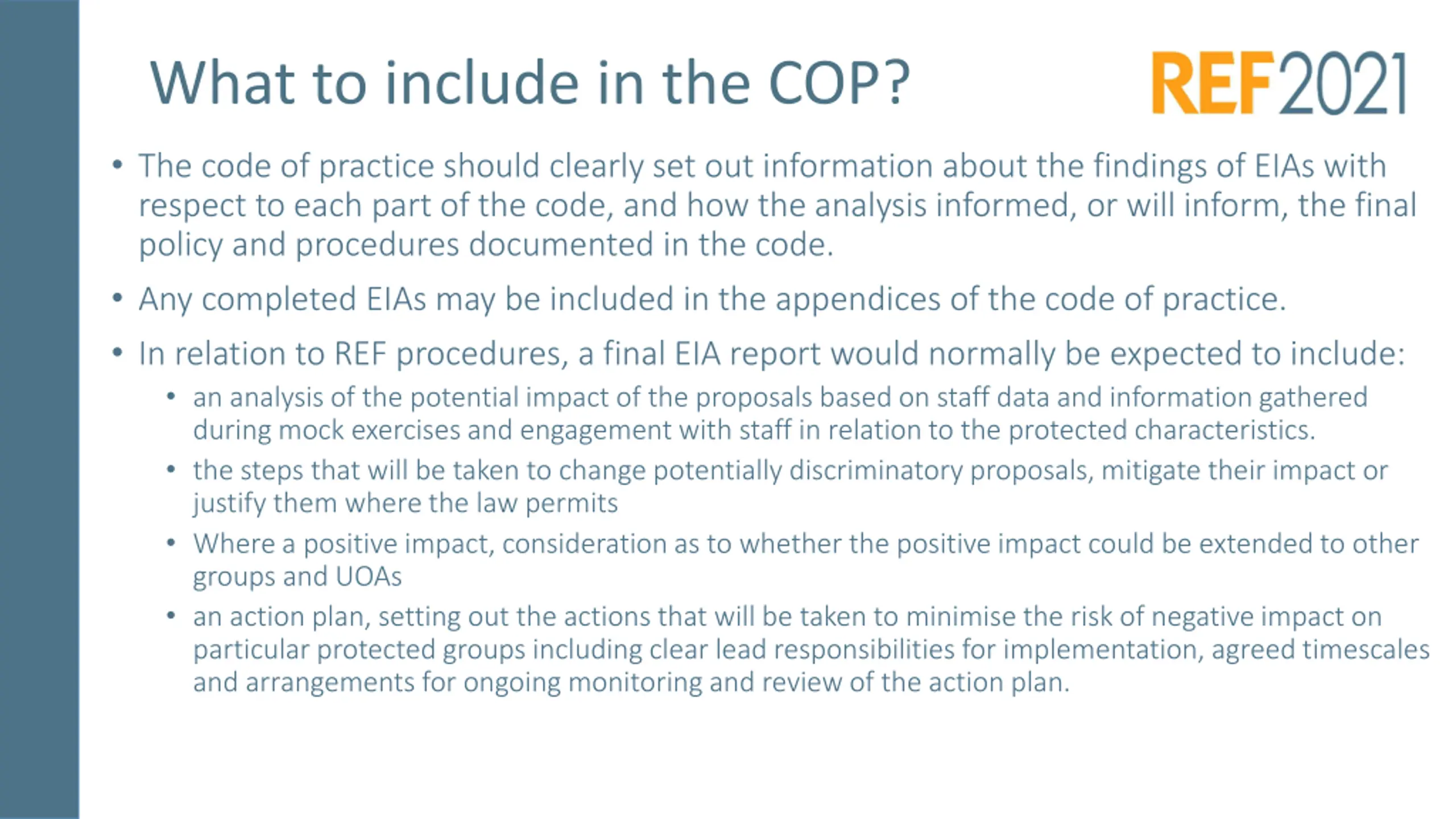 What to include in the COP? The code of practice should clearly set out information about the findings of EIAs with respect to each part of the code, and how the analysis informed, or will inform, the final policy and procedures documented in the code. Any completed EIAs may be included in the appendices of the code of practice. In relation to REF procedures, a final EIA report would normally be expected to include: an analysis of the potential impact of the proposals based on staff data and information gathered during mock exercises and engagement with staff in relation to the protected characteristics. the steps that will be taken to change potentially discriminatory proposals, mitigate their impact or justify them where the law permits Where a positive impact, consideration as to whether the positive impact could be extended to other groups and UOAs an action plan, setting out the actions that will be taken to minimise the risk of negative impact on particular protected groups including clear lead responsibilities for implementation, agreed timescales and arrangements for ongoing monitoring and review of the action plan.