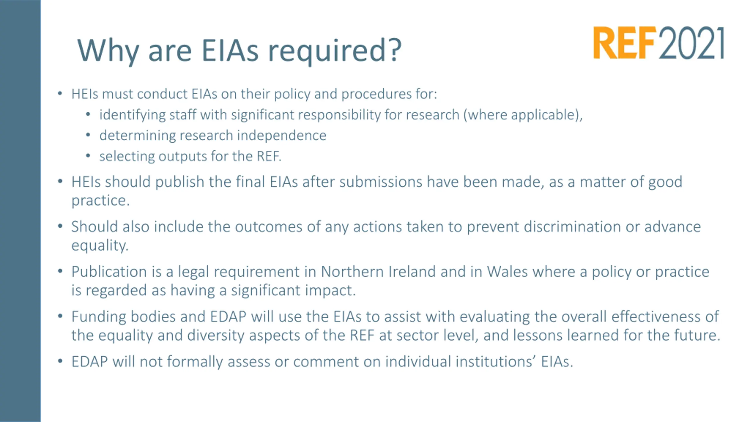 Why are EIAs required? HEIs must conduct EIAs on their policy and procedures for: identifying staff with significant responsibility for research (where applicable), determining research independence selecting outputs for the REF. HEIs should publish the final EIAs after submissions have been made, as a matter of good practice. Should also include the outcomes of any actions taken to prevent discrimination or advance equality. Publication is a legal requirement in Northern Ireland and in Wales where a policy or practice is regarded as having a significant impact. Funding bodies and EDAP will use the EIAs to assist with evaluating the overall effectiveness of the equality and diversity aspects of the REF at sector level, and lessons learned for the future. EDAP will not formally assess or comment on individual institutions EIAs.