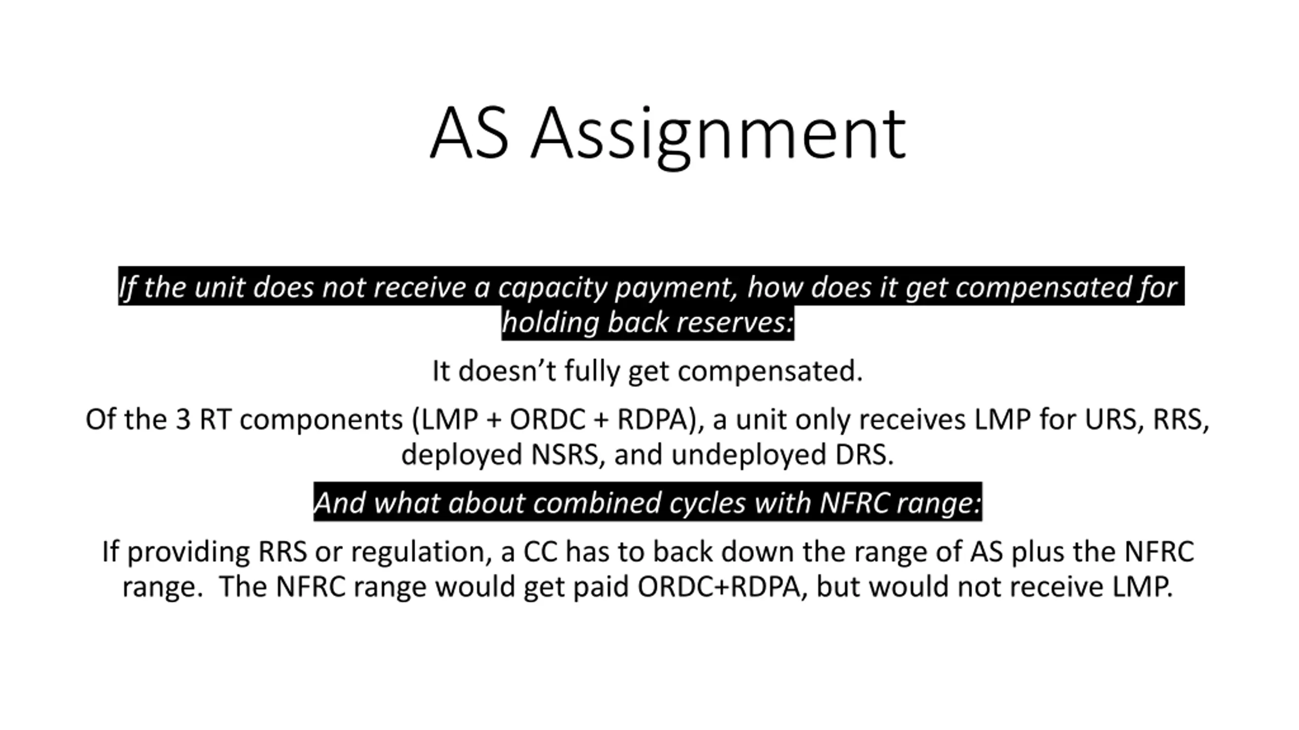 AS Assignment If the unit does not receive a capacity payment, how does it get compensated for holding back reserves: It doesn t fully get compensated. Of the 3 RT components (LMP + ORDC + RDPA), a unit only receives LMP for URS, RRS, deployed NSRS, and undeployed DRS. And what about combined cycles with NFRC range: If providing RRS or regulation, a CC has to back down the range of AS plus the NFRC range. The NFRC range would get paid ORDC+RDPA, but would not receive LMP.
